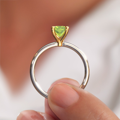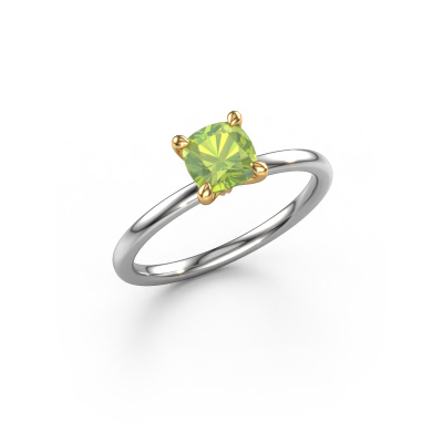 Bovenstaande verlovingsring heeft de naam Crystal CUS 1, dit type verlovingsring noemen we een solitaire ring omdat hij een enkele edelsteen bevat. De verlovingsring is uitgevoerd in 14 Carat witgoud en heeft een cushion peridoot ter grootte van 5.5 mm. Het leuke van onze configurator is dat je zelf je juweel kunt samenstellen tot een eigen persoonlijk juweel. Deze solitaire ring is uitgevoerd in de edelmetaal combinatie witgoud met goud, maar u kunt dus ook uit andere kleuren kiezen. Ieder juweel wordt met passie en liefde gemaakt door één van onze meestergoudsmeden.De solitaire verlovingsring is een bijzondere verlovingsring. Juist doordat de chatonzetting open is, creëert de lichtinval een schitterend effect op de edelsteen. Omdat de gekozen edelsteen hoog op de verlovingsring geplaatst wordt, wordt deze eigentijdse verlovingsring een prachtige eyecatcher. Met veel zorgvuldigheid vervaardigen wij alle details in deze solitaire verlovingsring met de hand, zodat jij binnenkort je aanzoek kunt bekronen met een unieke ring, speciaal voor de liefde van jouw leven!Omdat wij zelf alle verlovingsring maken en direct aan jou leveren kunnen wij je een verlovingsring leveren tegen een prijs die je nergens anders zult tegenkomen. Een ring wordt pas gemaakt als we een bestelling krijgen, hierdoor hebben wij geen dure voorraden en kunnen wij je de beste prijs garanderen. Wij begrijpen dat het kopen van een verlovingsring online spannend is en willen daarom je zoveel mogelijk informeren over alle specifieke eigenschappen van de ring die jij koopt.Ons team is iedere dag weer bezig om nieuwe ontwerpen toe te voegen, in samenwerking met onze designers en goudsmeden wordt gekeken hoe we tot het mooiste ontwerp kunnen komen. Wij doen ons best om tot een zo gevarieerd mogelijk aanbod te komen. Wellicht heb je zelf al een mooi idee van een sieraad dat je ooit wel eens gezien hebt. Neem dan eens vrijblijvend contact met ons op. Wij maken een offerte voor je op waarbij wij vrij zeker zijn dat we wat betreft kwaliteit en prijs jou versteld zullen laten staan.Om het voor jou makkelijker te maken kun je ieder besteld sieraad binnen 30 dagen na aflevering eenvoudig weer retour sturen.