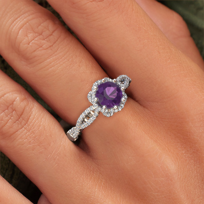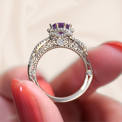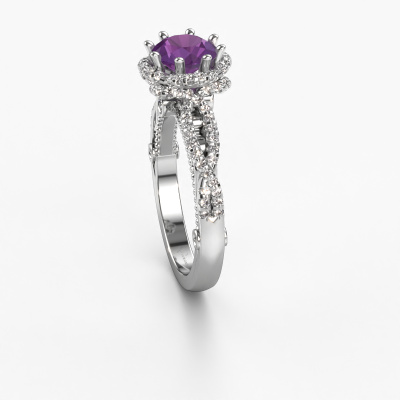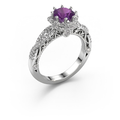 Deze verlovingsring heeft de naam Lysanne. Deze verlovingsring uitgevoerd in platina is gezet met 6.5 mm amethist. Deze filigraan platina verlovingsring is een meesterwerkje op zich. Een prachtig ontwerp van verfijnde draadjes die een uniek geheel vormen. Tegelijkertijd een mooie uitdaging voor onze gepassioneerd goudsmeden! Met veel toewijding, geduld en uiterste precisie vervaardigen zij deze verlovingsring speciaal voor jouw geliefde. Alles wordt met de hand gemaakt, waardoor ieder draadje tot in het kleinste detail perfect bewerkt kan worden. Een lang proces van smeden, bewerken en polijsten, totdat de meestersmid de verlovingsring in het licht houdt en tevreden is... een perfecte verlovingsring waar hij echt trots op is. Daarom is deze vintage filigraan verlovingsring ook een bijzondere verlovingsring om te schenken aan de liefde van je leven! Die ene persoon ga jij binnenkort vragen, en alleen voor deze persoon is deze unieke verlovingsring voor vervaardigd! Prachtig toch? Dit juweel is gemaakt door een team van gedreven goudsmeden en designers. Hierdoor zal dit unieke pronkstuk een echte eyecatcher zijn.Onze goudsmeden vervaardigen pas je Lysanne verlovingsring, zodra je deze besteld hebt. We hebben geen voorraden. Het voordeel hiervan is dat we de voorraad niet door hoeven te berekenen in de prijs, en kunnen daardoor sieraden leveren tegen een bijzonder lage prijs.Heb je zelf een specifieke verlovingsring ergens gezien, die je graag aan jouw geliefde zou willen geven? Bespreek gerust jouw ideeën met onze sieradenontwerpers, want wij zetten graag jouw ontwerp om tot een vintage verlovingsring. Je kunt tijdens het ontwerpproces steeds meekijken, omdat wij met 3D tekeningen werken. Je krijgt hierdoor al een realistische indruk van hoe jouw ontwerp er in werkelijkheid uit komt te zien. Daarbij kun je een dummy vooraf bestellen. Een dummy is een kunststof ring, die precies dezelfde vormen heeft als jouw uiteindelijke ontwerp. Je kunt deze passen en zien of de breedte en dikte bijvoorbeeld naar wens zijn. Wij sturen je graag een vrijblijvende offerte, waarbij je ongetwijfeld versteld zult staan over de prijs en de kwaliteit van de ring en edelstenen.Om het voor jou makkelijker te maken kun je ieder besteld sieraad binnen 30 dagen na aflevering eenvoudig weer retour sturen.