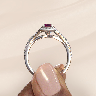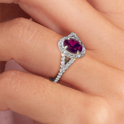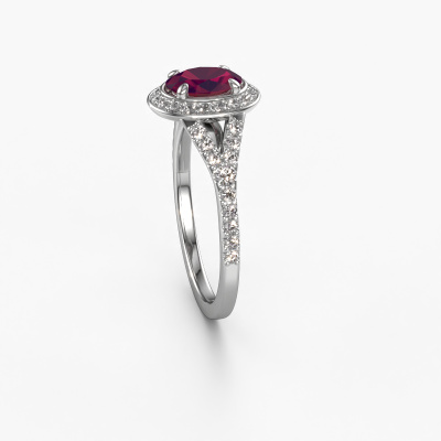 Bovenstaande belofte ring heeft de naam Pamela OVL. Dit type belofte ring noemen we een halo ring. De belofte ring is uitgevoerd in platina en heeft als middensteen een ovale rhodoliet ter grootte van 7x5 mm en eromheen zijn kleine lab-grown diamanten gezet. Het bijzondere van deze luxe platina halo belofte ring zijn de kleinere edelstenen die rondom de grote rhodoliet zijn gezet. Dat is ook waar deze mooie belofte ring zijn naam door heeft gekregen: halo betekent lichtkrans en dat is ook waar de kleinere edelstenen voor zorgen. Deze kleinere edelstenen moeten dan echter wel allen op dezelfde manier geplaatst zijn, zodat het licht niet doorbroken wordt in de rhodoliet en er inderdaad een prachtige lichtkrans gecreëerd wordt. En daar zorgen onze meestergoudsmeden voor. Met uiterste precisie wordt iedere zorgvuldig geselecteerde rhodoliet met de hand in de belofte ring geplaatst. Steeds opnieuw wordt de belofte ring tegen het licht gehouden om te zien of het speciale effect nog steeds zichtbaar is. Het resultaat is een unieke belofte ring, waarbij de gekozen rhodoliet letterlijk het stralende middelpunt wordt. Je kunt je voorstellen dat deze belofte ring werkelijk een betekenisvolle belofte ring is om aan jouw liefde voor het leven te schenken! Op de dag dat jij laat zien dat zij jouw stralende middelpunt is!Door onze modernste technieken kunnen wij met uiterste precisie prachtige sieraden te ontwerpen en voor jou personaliseren in de hoogste juwelierskwaliteit. Tegelijkertijd zijn onze belofte ringen altijd 30% goedkoper dan bij een andere juwelier. Dit komt doordat alle belofte ringen pas vervaardigd worden op het moment dat deze besteld wordt en we daardoor geen dure voorraden hoeven te hanteren. Mocht je aan een bepaald budget gebonden zijn, kunnen we je graag adviseren welke combinatie je het beste kunt kiezen.Ons team is iedere dag weer bezig om nieuwe ontwerpen toe te voegen, in samenwerking met onze designers en goudsmeden wordt gekeken hoe we tot het mooiste ontwerp kunnen komen. Wij doen ons best om tot een zo gevarieerd mogelijk aanbod te komen. Wellicht heb je zelf al een mooi idee van een sieraad dat je ooit wel eens gezien hebt. Neem dan eens vrijblijvend contact met ons op. Wij maken een offerte voor je op waarbij wij vrij zeker zijn dat we wat betreft kwaliteit en prijs jou versteld zullen laten staan.Om het voor jou makkelijker te maken kun je ieder besteld sieraad binnen 30 dagen na aflevering eenvoudig weer retour sturen.