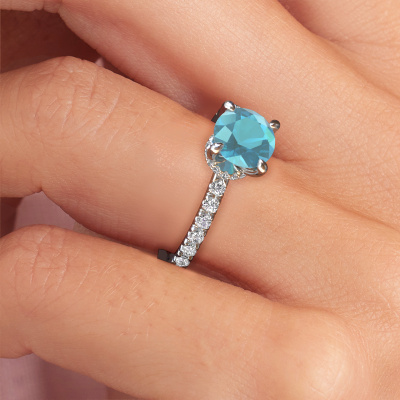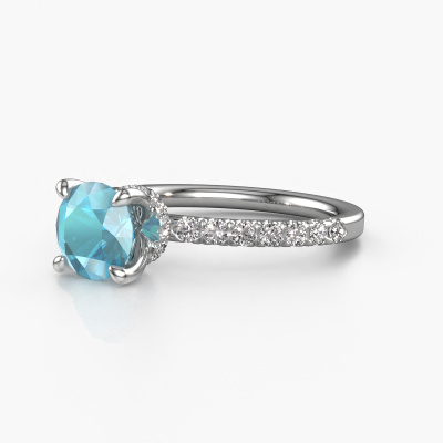 Bovenstaande verlovingsring heeft de naam Crystal rnd 4. Dit type verlovingsring noemen we een pavé solitaire verlovingsring omdat hij een enkele middensteen heeft waarbij de banden van de verlovingsring ook volgezet zijn. De verlovingsring is uitgevoerd in de combinatie platina met platina en heeft als middensteen een ronde blauw topaas ter grootte van 7 mm en in de zijbanden zijn lab-grown diamanten gezet. Ieder juweel is gemaakt om aan jouw vinger te stralen, ieder sieraad wordt met liefde door onze goudsmeden met de hand gemaakt.Deze fantasie platina pavé solitaire verlovingsring heeft een schitterende ronde blauw topaas als centersteen, waarbij in de band nog meer blauw topaas zijn gezet om de middensteen nog meer te accentueren. Doordat de zetting van de pootjes om de blauw topaas open is, vangt de blauw topaas het licht van alle kanten op en schittert hierdoor optimaal. Hierboven kun je zien hoe onze goudsmid de verlovingsring heel precies tot in de kleinste details heeft bewerkt, zodat de wat hoger gelegen blauw topaas een echte eyecatcher is. Wat een prachtige verlovingsring om te geven bij je aanzoek aan de liefde van jouw leven, aan jouw stralende middelpunt!Door onze modernste technieken kunnen wij met uiterste precisie prachtige sieraden te ontwerpen en voor jou personaliseren in de hoogste juwelierskwaliteit. Tegelijkertijd zijn onze verlovingsringen altijd 30% goedkoper dan bij een andere juwelier. Dit komt doordat alle verlovingsringen pas vervaardigd worden op het moment dat deze besteld wordt en we daardoor geen dure voorraden hoeven te hanteren. Mocht je aan een bepaald budget gebonden zijn, kunnen we je graag adviseren welke combinatie je het beste kunt kiezen.Heb je zelf een specifieke verlovingsring ergens gezien, die je graag aan jouw geliefde zou willen geven? Bespreek gerust jouw ideeën met onze sieradenontwerpers, want wij zetten graag jouw ontwerp om tot een fantasie verlovingsring. Je kunt tijdens het ontwerpproces steeds meekijken, omdat wij met 3D tekeningen werken. Je krijgt hierdoor al een realistische indruk van hoe jouw ontwerp er in werkelijkheid uit komt te zien. Daarbij kun je een dummy vooraf bestellen. Een dummy is een kunststof ring, die precies dezelfde vormen heeft als jouw uiteindelijke ontwerp. Je kunt deze passen en zien of de breedte en dikte bijvoorbeeld naar wens zijn. Wij sturen je graag een vrijblijvende offerte, waarbij je ongetwijfeld versteld zult staan over de prijs en de kwaliteit van de ring en edelstenen.Om het voor jou makkelijker te maken kun je ieder besteld sieraad binnen 30 dagen na aflevering eenvoudig weer retour sturen.