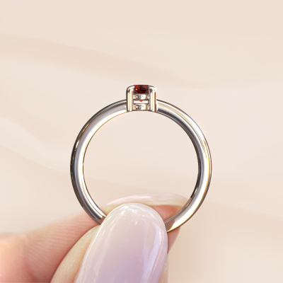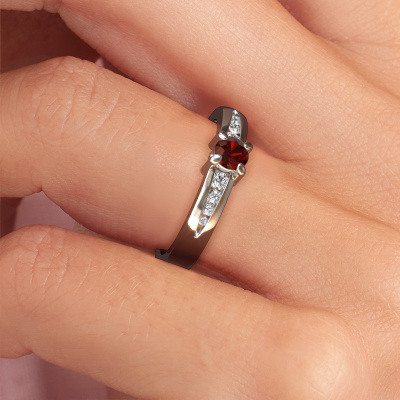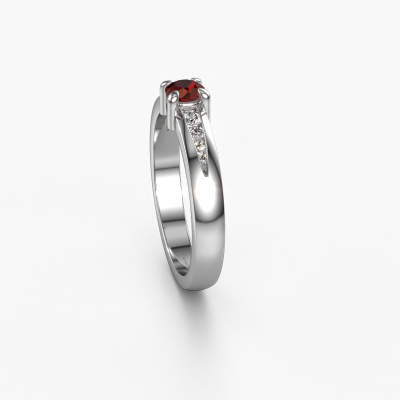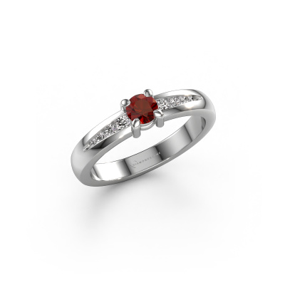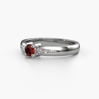Bovenstaande verlovingsring heeft de naam Zohra. Dit type verlovingsring noemen we een pavé solitaire verlovingsring omdat hij een enkele middensteen heeft waarbij de banden van de verlovingsring ook volgezet zijn. De verlovingsring is uitgevoerd in de combinatie platina met platina en heeft als middensteen een ronde granaat ter grootte van 4 mm en in de zijbanden zijn diamanten gezet. Ieder juweel wordt speciaal voor jou gemaakt door onze meester goudsmeden in ons eigen atelier.Deze moderne platina pavé solitaire verlovingsring heeft een schitterende ronde granaat als centersteen, waarbij in de band nog meer granaat zijn gezet om de middensteen nog meer te accentueren. Doordat de zetting van de pootjes om de granaat open is, vangt de granaat het licht van alle kanten op en schittert hierdoor optimaal. Hierboven kun je zien hoe onze goudsmid de verlovingsring heel precies tot in de kleinste details heeft bewerkt, zodat de wat hoger gelegen granaat een echte eyecatcher is. Wat een prachtige verlovingsring om te geven bij je aanzoek aan de liefde van jouw leven, aan jouw stralende middelpunt!Omdat wij zelf alle verlovingsring maken en direct aan jou leveren kunnen wij je een verlovingsring leveren tegen een prijs die je nergens anders zult tegenkomen. Een ring wordt pas gemaakt als we een bestelling krijgen, hierdoor hebben wij geen dure voorraden en kunnen wij je de beste prijs garanderen. Wij begrijpen dat het kopen van een verlovingsring online spannend is en willen daarom je zoveel mogelijk informeren over alle specifieke eigenschappen van de ring die jij koopt.Ons team is iedere dag weer bezig om nieuwe ontwerpen toe te voegen, in samenwerking met onze designers en goudsmeden wordt gekeken hoe we tot het mooiste ontwerp kunnen komen. Wij doen ons best om tot een zo gevarieerd mogelijk aanbod te komen. Wellicht heb je zelf al een mooi idee van een sieraad dat je ooit wel eens gezien hebt. Neem dan eens vrijblijvend contact met ons op. Wij maken een offerte voor je op waarbij wij vrij zeker zijn dat we wat betreft kwaliteit en prijs jou versteld zullen laten staan.Om het voor jou makkelijker te maken kun je ieder besteld sieraad binnen 30 dagen na aflevering eenvoudig weer retour sturen.