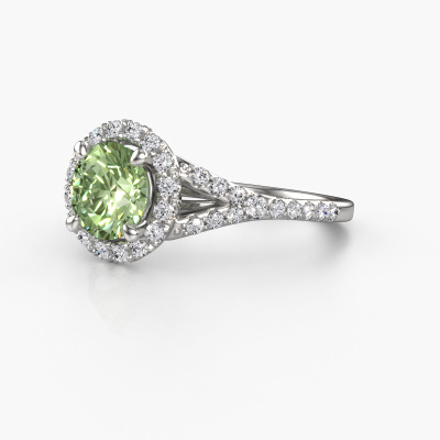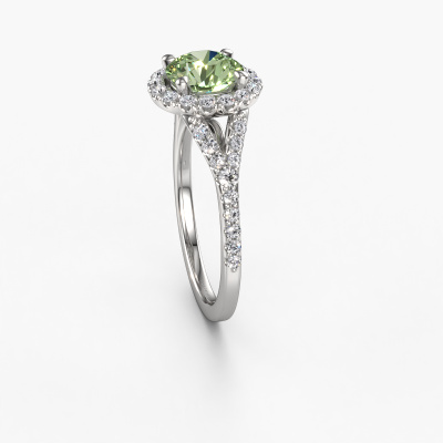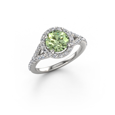Bovenstaande verlovingsring heeft de naam Kimber RND. Dit type verlovingsring noemen we een pavé solitaire verlovingsring omdat hij een enkele middensteen heeft waarbij de banden van de verlovingsring ook volgezet zijn. De verlovingsring is uitgevoerd in de combinatie platina met platina en heeft als middensteen een ronde groene lab grown diamant ter grootte van 7 mm en in de zijbanden zijn lab-grown diamanten gezet. Ieder juweel is gemaakt om aan je vinger te stralen, ieder sieraad wordt met liefde door onze goudsmeden met de hand gemaakt.Deze klassieke platina pavé solitaire verlovingsring heeft een schitterende ronde groene lab grown diamant als centersteen, waarbij in de band nog meer groene lab grown diamanten zijn gezet om de middensteen nog meer te accentueren. Doordat de zetting van de pootjes om de groene lab grown diamant open is, vangt de groene lab grown diamant het licht van alle kanten op en schittert hierdoor optimaal. Hierboven kun je zien hoe onze goudsmid de verlovingsring heel precies tot in de kleinste details heeft bewerkt, zodat de wat hoger gelegen groene lab grown diamant een echte eyecatcher is. Wat een prachtige verlovingsring om te geven bij je aanzoek aan de liefde van jouw leven, aan jouw stralende middelpunt!Wist je dat we een beste prijs garantie geven voor jouw verlovingsring? Dit is mogelijk omdat al onze sieraden met de hand gemaakt worden in ons eigen atelier. We hebben geen dure voorraden, en we maken pas je verlovingsring op het moment dat je besteld hebt. Doordat we de hele productie zelf in de hand hebben, kunnen wij je goed informeren over alle eigenschappen van deze ring. Juist omdat het kopen van een verlovingsring online spannend is, begrijpen wij dat het fijn is om alle kenmerken te weten van jouw ring.Ons team is iedere dag weer bezig om nieuwe ontwerpen toe te voegen, in samenwerking met onze designers en goudsmeden wordt gekeken hoe we tot het mooiste ontwerp kunnen komen. Wij doen ons best om tot een zo gevarieerd mogelijk aanbod te komen. Wellicht heb je zelf al een mooi idee van een sieraad dat je ooit wel eens gezien hebt. Neem dan eens vrijblijvend contact met ons op. Wij maken een offerte voor je op waarbij wij vrij zeker zijn dat we wat betreft kwaliteit en prijs jou versteld zullen laten staan.Om het voor jou makkelijker te maken kun je ieder besteld sieraad binnen 30 dagen na aflevering eenvoudig weer retour sturen.