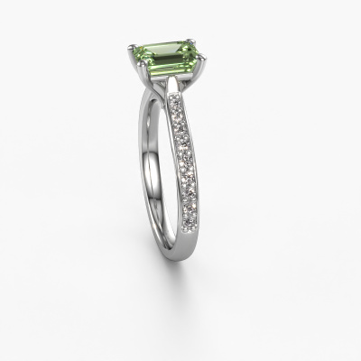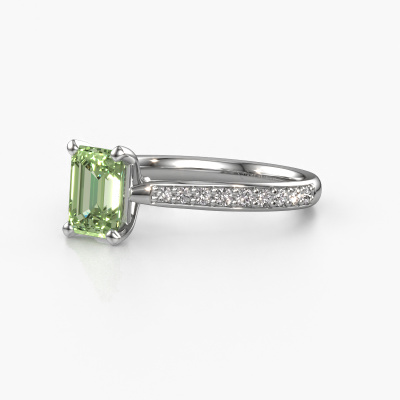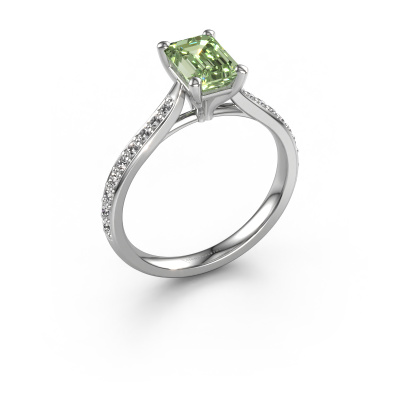 Bovenstaande verlovingsring heeft de naam Mignon eme 2. Dit type verlovingsring noemen we een pavé solitaire verlovingsring omdat hij een enkele middensteen heeft waarbij de banden van de verlovingsring ook volgezet zijn. De verlovingsring is uitgevoerd in de combinatie platina met platina en heeft als middensteen een smaragd geslepen groene lab grown diamant ter grootte van 7x5 mm en in de zijbanden zijn lab-grown diamanten gezet. Ieder juweel is speciaal voor jou gemaakt, met aandacht voor detail en design.Deze exclusieve platina pavé solitaire verlovingsring heeft een schitterende smaragd geslepen groene lab grown diamant als centersteen, waarbij in de band nog meer groene lab grown diamanten zijn gezet om de middensteen nog meer te accentueren. Doordat de zetting van de pootjes om de groene lab grown diamant open is, vangt de groene lab grown diamant het licht van alle kanten op en schittert hierdoor optimaal. Hierboven kun je zien hoe onze goudsmid de verlovingsring heel precies tot in de kleinste details heeft bewerkt, zodat de wat hoger gelegen groene lab grown diamant een echte eyecatcher is. Wat een prachtige verlovingsring om te geven bij je aanzoek aan de liefde van jouw leven, aan jouw stralende middelpunt!Wellicht is het je opgevallen dat onze prijzen gemiddeld 30% lager liggen dan bij een andere juwelier. En dat terwijl de kwaliteit in de meeste gevallen nog beter is! Dit komt doordat onze goudsmeden je verlovingsring direct in ons eigen atelier vervaardigen. Hierdoor hoeven we geen dure voorraden te hanteren en kunnen we ieder gewenst detail direct op jouw verlovingsring aanbrengen.Heb je zelf een speciale ring in gedachten, die je wellicht ergens gezien hebt? Je kunt je ideeën altijd met ons bespreken, wij zetten graag jouw ontwerp om tot een unieke verlovingsring. Het ontwerp kun je volgen, omdat wij met 3D tekeningen werken. Hierdoor krijg je al een realistische indruk van hoe jouw ontwerp er in het echt uit komt te zien. Wij sturen je graag een vrijblijvende offerte, waarbij je ongetwijfeld verwonderd zult zijn over de prijs in combinatie met de uitstekende kwaliteit die we aanbieden.Om het voor jou makkelijker te maken kun je ieder besteld sieraad binnen 30 dagen na aflevering eenvoudig weer retour sturen.