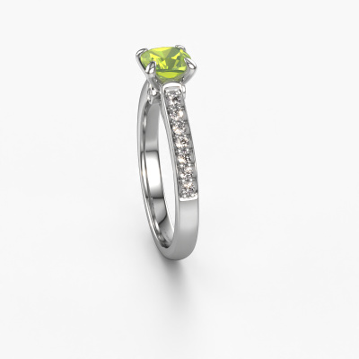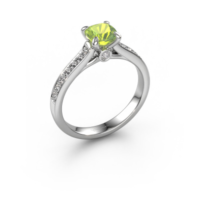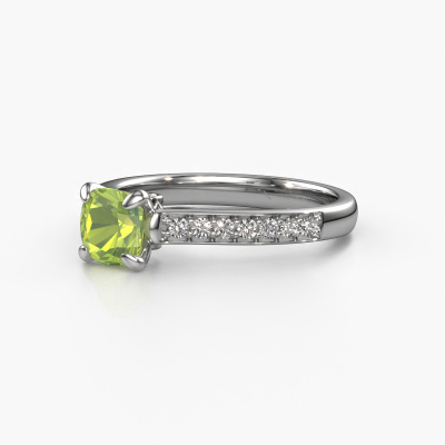 Bovenstaande verlovingsring heeft de naam Valorie cus 2. Dit type verlovingsring noemen we een pavé solitaire verlovingsring omdat hij een enkele middensteen heeft waarbij de banden van de verlovingsring ook volgezet zijn. De verlovingsring is uitgevoerd in de combinatie platina met platina en heeft als middensteen een cushion peridoot ter grootte van 5.5 mm en in de zijbanden zijn diamanten gezet. Ieder juweel wordt speciaal voor jou gemaakt door onze meester goudsmeden in ons eigen atelier.Deze traditionele platina pavé solitaire verlovingsring heeft een schitterende cushion peridoot als centersteen, waarbij in de band nog meer peridoot zijn gezet om de middensteen nog meer te accentueren. Doordat de zetting van de pootjes om de peridoot open is, vangt de peridoot het licht van alle kanten op en schittert hierdoor optimaal. Hierboven kun je zien hoe onze goudsmid de verlovingsring heel precies tot in de kleinste details heeft bewerkt, zodat de wat hoger gelegen peridoot een echte eyecatcher is. Wat een prachtige verlovingsring om te geven bij je aanzoek aan de liefde van jouw leven, aan jouw stralende middelpunt!Door het gebruik van de modernste technieken, gecombineerd met ambachtelijk vakmanschap kunnen wij alle verlovingsringen zelf in ons atelier maken. Ieder sieraad wordt pas gemaakt nadat deze besteld is. Dit heeft als bijkomend voordeel dat we kunnen leveren tegen een prijs die je nergens anders tegenkomt.Iedere dag is ons team van goudsmeden en sieradenontwerpers aan het werk om nieuwe sieraden te creëren. Het kan zijn dat je ergens een traditionele verlovingsring gezien hebt, die je als basis wilt nemen bij het ontwerpen van jouw unieke ring. Neem gerust contact met ons op en we zullen je een aanbod doen, waar je vrijwel zeker verwonderd zult zijn over de kwaliteit en de prijs.Om het voor jou makkelijker te maken kun je ieder besteld sieraad binnen 30 dagen na aflevering eenvoudig weer retour sturen.