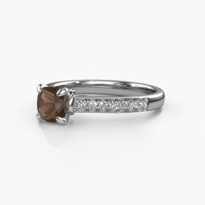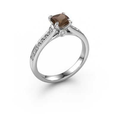 Bovenstaande verlovingsring heeft de naam Valorie cus 2. Dit type verlovingsring noemen we een pavé solitaire verlovingsring omdat hij een enkele middensteen heeft waarbij de banden van de verlovingsring ook volgezet zijn. De verlovingsring is uitgevoerd in de combinatie platina met platina en heeft als middensteen een cushion rookkwarts ter grootte van 5.5 mm en in de zijbanden zijn diamanten gezet. Ieder juweel wordt speciaal voor jou gemaakt door onze meester goudsmeden in ons eigen atelier.Deze traditionele platina pavé solitaire verlovingsring heeft een schitterende cushion rookkwarts als centersteen, waarbij in de band nog meer rookkwarts zijn gezet om de middensteen nog meer te accentueren. Doordat de zetting van de pootjes om de rookkwarts open is, vangt de rookkwarts het licht van alle kanten op en schittert hierdoor optimaal. Hierboven kun je zien hoe onze goudsmid de verlovingsring heel precies tot in de kleinste details heeft bewerkt, zodat de wat hoger gelegen rookkwarts een echte eyecatcher is. Wat een prachtige verlovingsring om te geven bij je aanzoek aan de liefde van jouw leven, aan jouw stralende middelpunt!Door het gebruik van de modernste technieken, gecombineerd met ambachtelijk vakmanschap kunnen wij alle verlovingsringen zelf in ons atelier maken. Ieder sieraad wordt pas gemaakt nadat deze besteld is. Dit heeft als bijkomend voordeel dat we kunnen leveren tegen een prijs die je nergens anders tegenkomt.Iedere dag is ons team van goudsmeden en sieradenontwerpers aan het werk om nieuwe sieraden te creëren. Het kan zijn dat je ergens een traditionele verlovingsring gezien hebt, die je als basis wilt nemen bij het ontwerpen van jouw unieke ring. Neem gerust contact met ons op en we zullen je een aanbod doen, waar je vrijwel zeker verwonderd zult zijn over de kwaliteit en de prijs.Om het voor jou makkelijker te maken kun je ieder besteld sieraad binnen 30 dagen na aflevering eenvoudig weer retour sturen.