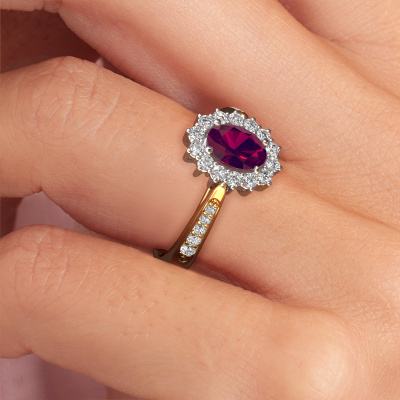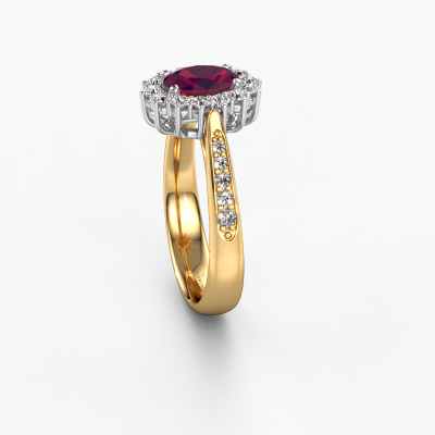 Bovenstaande verlovingsring heeft de naam Margien 2. Dit type verlovingsring noemen we een Lady Diana ring, hierbij worden rondom de middensteen in een open zetting allemaal kleine edelstenen gezet. Deze verlovingsring uitgevoerd in 14 Carat goud heeft een ovale rhodoliet van 7x5 mm als center steen met daaromheen kleine diamanten. Je kent hem wel, deze prachtige traditionele gouden Lady Diana Ring... de bekendste en meest besproken verlovingsring ter wereld speciaal voor de meest bijzondere persoon in jouw leven! Heel speciaal aan deze Lady Diana verlovingsring is de prachtige rhodoliet in het midden. De kleinere edelstenen in de verlovingsring om de rhodoliet heen versterken de schittering van de middelste steen, waardoor het lijkt alsof je één grote edelsteen draagt. Bij het ontwerp van deze Lady Di verlovingsring wordt dit effect nog meer bekrachtigd. Het bijzondere is, dat onze goudsmeden deze verlovingsring graag voor jou uniek vervaardigen. Doordat de Lady Diana verlovingsring met de hand gemaakt wordt in ons eigen atelier beneden, kunnen wij deze aanpassen zoals jij in gedachten hebt. Dit juweel is gemaakt om aan je vinger te stralen, ieder sieraad wordt met liefde door onze goudsmeden met de hand gemaakt.Wellicht is het je opgevallen dat onze prijzen gemiddeld 30% lager liggen dan bij een andere juwelier. En dat terwijl de kwaliteit in de meeste gevallen nog beter is! Dit komt doordat onze goudsmeden je verlovingsring direct in ons eigen atelier vervaardigen. Hierdoor hoeven we geen dure voorraden te hanteren en kunnen we ieder gewenst detail direct op jouw verlovingsring aanbrengen.Ons team is iedere dag weer bezig om nieuwe ontwerpen toe te voegen, in samenwerking met onze designers en goudsmeden wordt gekeken hoe we tot het mooiste ontwerp kunnen komen. Wij doen ons best om tot een zo gevarieerd mogelijk aanbod te komen. Wellicht heb je zelf al een mooi idee van een sieraad dat je ooit wel eens gezien hebt. Neem dan eens vrijblijvend contact met ons op. Wij maken een offerte voor je op waarbij wij vrij zeker zijn dat we wat betreft kwaliteit en prijs jou versteld zullen laten staan.Om het voor jou makkelijker te maken kun je ieder besteld sieraad binnen 30 dagen na aflevering eenvoudig weer retour sturen.
