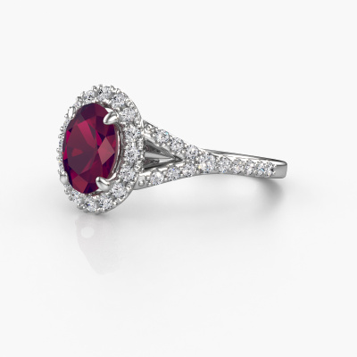 Bovenstaande verlovingsring heeft de naam Kimber OVL. Dit type verlovingsring noemen we een pavé solitaire verlovingsring omdat hij een enkele middensteen heeft waarbij de banden van de verlovingsring ook volgezet zijn. De verlovingsring is uitgevoerd in de combinatie platina met platina en heeft als middensteen een ovale rhodoliet ter grootte van 8x6 mm en in de zijbanden zijn lab-grown diamanten gezet. Ieder juweel wordt met passie en liefde gemaakt door één van onze meestergoudsmeden.Deze exclusieve platina pavé solitaire verlovingsring heeft een schitterende ovale rhodoliet als centersteen, waarbij in de band nog meer rhodoliet zijn gezet om de middensteen nog meer te accentueren. Doordat de zetting van de pootjes om de rhodoliet open is, vangt de rhodoliet het licht van alle kanten op en schittert hierdoor optimaal. Hierboven kun je zien hoe onze goudsmid de verlovingsring heel precies tot in de kleinste details heeft bewerkt, zodat de wat hoger gelegen rhodoliet een echte eyecatcher is. Wat een prachtige verlovingsring om te geven bij je aanzoek aan de liefde van jouw leven, aan jouw stralende middelpunt!Door het gebruik van de modernste technieken, gecombineerd met ambachtelijk vakmanschap kunnen wij alle verlovingsringen zelf in ons atelier maken. Ieder sieraad wordt pas gemaakt nadat deze besteld is. Dit heeft als bijkomend voordeel dat we kunnen leveren tegen een prijs die je nergens anders tegenkomt.Ons team is iedere dag weer bezig om nieuwe ontwerpen toe te voegen, in samenwerking met onze designers en goudsmeden wordt gekeken hoe we tot het mooiste ontwerp kunnen komen. Wij doen ons best om tot een zo gevarieerd mogelijk aanbod te komen. Wellicht heb je zelf al een mooi idee van een sieraad dat je ooit wel eens gezien hebt. Neem dan eens vrijblijvend contact met ons op. Wij maken een offerte voor je op waarbij wij vrij zeker zijn dat we wat betreft kwaliteit en prijs jou versteld zullen laten staan.Om het voor jou makkelijker te maken kun je ieder besteld sieraad binnen 30 dagen na aflevering eenvoudig weer retour sturen.