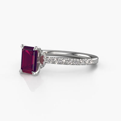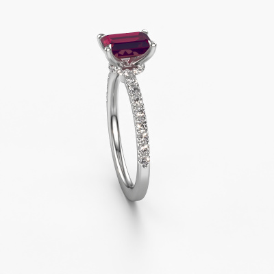 Bovenstaande verlovingsring heeft de naam Crystal EME 4. Dit type verlovingsring noemen we een pavé solitaire verlovingsring omdat hij een enkele middensteen heeft waarbij de banden van de verlovingsring ook volgezet zijn. De verlovingsring is uitgevoerd in de combinatie platina met platina en heeft als middensteen een smaragd geslepen rhodoliet ter grootte van 7x5 mm en in de zijbanden zijn lab-grown diamanten gezet. Ieder juweel is gemaakt om aan je vinger te stralen, ieder sieraad wordt met liefde door onze goudsmeden met de hand gemaakt.Deze modieuze platina pavé solitaire verlovingsring heeft een schitterende smaragd geslepen rhodoliet als centersteen, waarbij in de band nog meer rhodoliet zijn gezet om de middensteen nog meer te accentueren. Doordat de zetting van de pootjes om de rhodoliet open is, vangt de rhodoliet het licht van alle kanten op en schittert hierdoor optimaal. Hierboven kun je zien hoe onze goudsmid de verlovingsring heel precies tot in de kleinste details heeft bewerkt, zodat de wat hoger gelegen rhodoliet een echte eyecatcher is. Wat een prachtige verlovingsring om te geven bij je aanzoek aan de liefde van jouw leven, aan jouw stralende middelpunt!Wist je dat we een beste prijs garantie geven voor jouw verlovingsring? Dit is mogelijk omdat al onze sieraden met de hand gemaakt worden in ons eigen atelier. We hebben geen dure voorraden, en we maken pas je verlovingsring op het moment dat je besteld hebt. Doordat we de hele productie zelf in de hand hebben, kunnen wij je goed informeren over alle eigenschappen van deze ring. Juist omdat het kopen van een verlovingsring online spannend is, begrijpen wij dat het fijn is om alle kenmerken te weten van jouw ring.Ons team is iedere dag weer bezig om nieuwe ontwerpen toe te voegen, in samenwerking met onze designers en goudsmeden wordt gekeken hoe we tot het mooiste ontwerp kunnen komen. Wij doen ons best om tot een zo gevarieerd mogelijk aanbod te komen. Wellicht heb je zelf al een mooi idee van een sieraad dat je ooit wel eens gezien hebt. Neem dan eens vrijblijvend contact met ons op. Wij maken een offerte voor je op waarbij wij vrij zeker zijn dat we wat betreft kwaliteit en prijs jou versteld zullen laten staan.Om het voor jou makkelijker te maken kun je ieder besteld sieraad binnen 30 dagen na aflevering eenvoudig weer retour sturen.