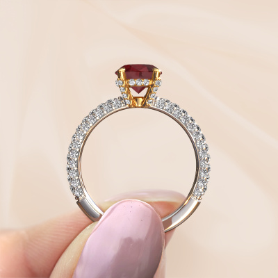 Bovenstaande verlovingsring heeft de naam Saskia 2 ovl. Dit type verlovingsring noemen we een pavé solitaire verlovingsring omdat hij een enkele middensteen heeft waarbij de banden van de verlovingsring ook volgezet zijn. De verlovingsring is uitgevoerd in de combinatie 14 Carat witgoud met goud en heeft als middensteen een ovale robijn ter grootte van 9x7 mm en in de zijbanden zijn lab-grown diamanten gezet. Ieder juweel wordt speciaal voor jou gemaakt door onze meester goudsmeden in ons eigen atelier.Deze exclusieve witgouden pavé solitaire verlovingsring heeft een schitterende ovale robijn als centersteen, waarbij in de band nog meer robijn zijn gezet om de middensteen nog meer te accentueren. Doordat de zetting van de pootjes om de robijn open is, vangt de robijn het licht van alle kanten op en schittert hierdoor optimaal. Hierboven kun je zien hoe onze goudsmid de verlovingsring heel precies tot in de kleinste details heeft bewerkt, zodat de wat hoger gelegen robijn een echte eyecatcher is. Wat een prachtige verlovingsring om te geven bij je aanzoek aan de liefde van jouw leven, aan jouw stralende middelpunt!Wist je dat we een beste prijs garantie geven voor jouw verlovingsring? Dit is mogelijk omdat al onze sieraden met de hand gemaakt worden in ons eigen atelier. We hebben geen dure voorraden, en we maken pas je verlovingsring op het moment dat je besteld hebt. Doordat we de hele productie zelf in de hand hebben, kunnen wij je goed informeren over alle eigenschappen van deze ring. Juist omdat het kopen van een verlovingsring online spannend is, begrijpen wij dat het fijn is om alle kenmerken te weten van jouw ring.Heb je zelf een specifieke verlovingsring ergens gezien, die je graag aan jouw geliefde zou willen geven? Bespreek gerust jouw ideeën met onze sieradenontwerpers, want wij zetten graag jouw ontwerp om tot een exclusieve verlovingsring. Je kunt tijdens het ontwerpproces steeds meekijken, omdat wij met 3D tekeningen werken. Je krijgt hierdoor al een realistische indruk van hoe jouw ontwerp er in werkelijkheid uit komt te zien. Daarbij kun je een dummy vooraf bestellen. Een dummy is een kunststof ring, die precies dezelfde vormen heeft als jouw uiteindelijke ontwerp. Je kunt deze passen en zien of de breedte en dikte bijvoorbeeld naar wens zijn. Wij sturen je graag een vrijblijvende offerte, waarbij je ongetwijfeld versteld zult staan over de prijs en de kwaliteit van de ring en edelstenen.Om het voor jou makkelijker te maken kun je ieder besteld sieraad binnen 30 dagen na aflevering eenvoudig weer retour sturen.