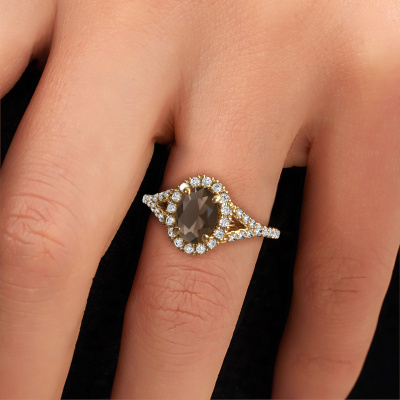Bovenstaande verlovingsring heeft de naam Kimber OVL. Dit type verlovingsring noemen we een pavé solitaire verlovingsring omdat hij een enkele middensteen heeft waarbij de banden van de verlovingsring ook volgezet zijn. De verlovingsring is uitgevoerd in de combinatie 14 Carat goud met goud en heeft als middensteen een ovale rookkwarts ter grootte van 8x6 mm en in de zijbanden zijn lab-grown diamanten gezet. Ieder juweel wordt met passie en liefde gemaakt door één van onze meestergoudsmeden.Deze exclusieve gouden pavé solitaire verlovingsring heeft een schitterende ovale rookkwarts als centersteen, waarbij in de band nog meer rookkwarts zijn gezet om de middensteen nog meer te accentueren. Doordat de zetting van de pootjes om de rookkwarts open is, vangt de rookkwarts het licht van alle kanten op en schittert hierdoor optimaal. Hierboven kun je zien hoe onze goudsmid de verlovingsring heel precies tot in de kleinste details heeft bewerkt, zodat de wat hoger gelegen rookkwarts een echte eyecatcher is. Wat een prachtige verlovingsring om te geven bij je aanzoek aan de liefde van jouw leven, aan jouw stralende middelpunt!Door het gebruik van de modernste technieken, gecombineerd met ambachtelijk vakmanschap kunnen wij alle verlovingsringen zelf in ons atelier maken. Ieder sieraad wordt pas gemaakt nadat deze besteld is. Dit heeft als bijkomend voordeel dat we kunnen leveren tegen een prijs die je nergens anders tegenkomt.Ons team is iedere dag weer bezig om nieuwe ontwerpen toe te voegen, in samenwerking met onze designers en goudsmeden wordt gekeken hoe we tot het mooiste ontwerp kunnen komen. Wij doen ons best om tot een zo gevarieerd mogelijk aanbod te komen. Wellicht heb je zelf al een mooi idee van een sieraad dat je ooit wel eens gezien hebt. Neem dan eens vrijblijvend contact met ons op. Wij maken een offerte voor je op waarbij wij vrij zeker zijn dat we wat betreft kwaliteit en prijs jou versteld zullen laten staan.Om het voor jou makkelijker te maken kun je ieder besteld sieraad binnen 30 dagen na aflevering eenvoudig weer retour sturen.