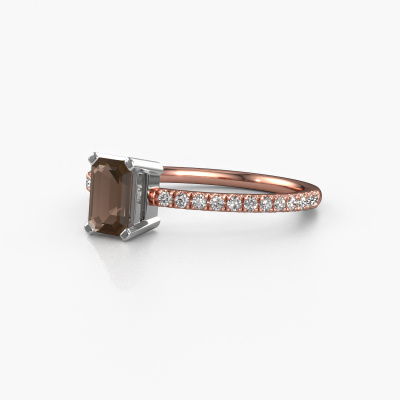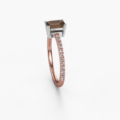 Bovenstaande verlovingsring heeft de naam Denita 2 EME. Dit type verlovingsring noemen we een pavé solitaire verlovingsring omdat hij een enkele middensteen heeft waarbij de banden van de verlovingsring ook volgezet zijn. Deze verlovingsring is uitgevoerd in 14 Carat rosé goud en heeft als middensteen een smaragd geslepen rookkwarts ter grootte van 6x4 mm, en in de zijbanden zijn diamanten gezet. Ieder juweel wordt speciaal voor jou gemaakt door onze meester goudsmeden in ons eigen atelier.. Deze traditionele rosé gouden pavé solitaire verlovingsring heeft een schitterende smaragd geslepen rookkwarts als center steen, waarbij in de band nog meer diamanten zijn gezet om de middensteen nog meer te accentueren. Doordat de zetting van de pootjes om de rookkwarts open is, vangt de rookkwarts het licht van alle kanten op en schittert hierdoor optimaal. Hierboven kun je zien hoe onze goudsmid de verlovingsring heel precies tot in de kleinste details heeft bewerkt, zodat de wat hoger gelegen rookkwarts een echte eyecatcher is. Wat een prachtige verlovingsring om te geven bij je aanzoek aan de liefde van jouw leven, aan jouw stralende middelpunt!Wellicht is het je opgevallen dat onze prijzen gemiddeld 30% lager liggen dan bij een andere juwelier. En dat terwijl de kwaliteit in de meeste gevallen nog beter is! Dit komt doordat onze goudsmeden je verlovingsring direct in ons eigen atelier vervaardigen. Hierdoor hoeven we geen dure voorraden te hanteren en kunnen we ieder gewenst detail direct op jouw verlovingsring aanbrengen.Ons team is iedere dag weer bezig om nieuwe ontwerpen toe te voegen, in samenwerking met onze designers en goudsmeden wordt gekeken hoe we tot het mooiste ontwerp kunnen komen. Wij doen ons best om tot een zo gevarieerd mogelijk aanbod te komen. Wellicht heb je zelf al een mooi idee van een sieraad dat je ooit wel eens gezien hebt. Neem dan eens vrijblijvend contact met ons op. Wij maken een offerte voor je op waarbij wij vrij zeker zijn dat we wat betreft kwaliteit en prijs jou versteld zullen laten staan.Om het voor jou makkelijker te maken kun je ieder besteld sieraad binnen 30 dagen na aflevering eenvoudig weer retour sturen.