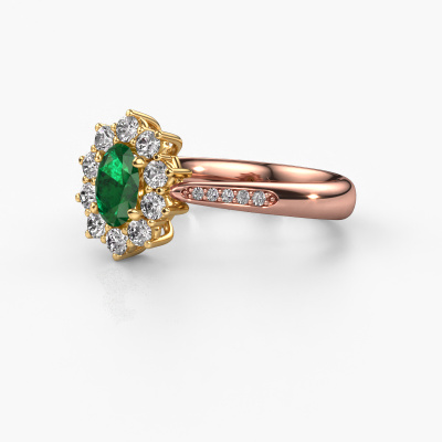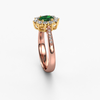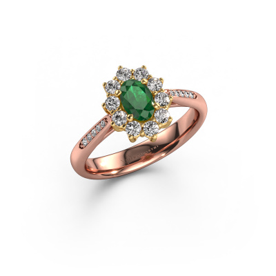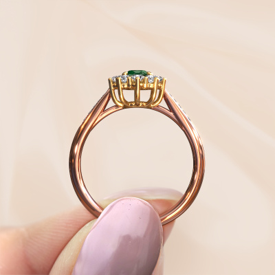 Bovenstaande verlovingsring heeft de naam Leesa 2. Dit type verlovingsring noemen we een entourage ring, hierbij worden rondom de middensteen in een open zetting allemaal kleine edelstenen gezet. Deze verlovingsring uitgevoerd in 14 Carat rosé goud heeft een ovale smaragd van 6x4 mm als center steen met daaromheen kleine diamanten. Het opvallende aan deze klassieke rosé gouden entourage verlovingsring is de vorm: de kleine edelstenen vormen samen met de smaragd een prachtige bloem, die lijkt samen te smelten tot één fonkelende edelsteen. Deze verlovingsring wordt ook wel de flower of de rozet verlovingsring genoemd. Onze meestergoudsmeden zorgen ervoor dat de kleinere diamanten allen op dezelfde manier geplaatst worden, zodat het licht niet onderbroken wordt in de smaragd en er inderdaad een prachtige eenheid gecreëerd wordt. Met een geoefend oog en een vaardige hand wordt iedere zorgvuldig geselecteerde smaragd in de verlovingsring geplaatst. Steeds opnieuw wordt de verlovingsring onder de loep gehouden om te zien of het speciale effect nog steeds zichtbaar is. Het resultaat is een unieke verlovingsring, waarbij de gekozen smaragd letterlijk het stralende middelpunt wordt. Wat een prachtige, betekenisvolle verlovingsring om te geven aan het stralende middelpunt in jouw leven! Wellicht is het je opgevallen dat onze prijzen gemiddeld 30% lager liggen dan bij een andere juwelier. En dat terwijl de kwaliteit in de meeste gevallen nog beter is! Dit komt doordat onze goudsmeden je verlovingsring direct in ons eigen atelier vervaardigen. Hierdoor hoeven we geen dure voorraden te hanteren en kunnen we ieder gewenst detail direct op jouw verlovingsring aanbrengen.Iedere dag is ons team van goudsmeden en sieradenontwerpers aan het werk om nieuwe sieraden te creëren. Het kan zijn dat je ergens een klassieke verlovingsring gezien hebt, die je als basis wilt nemen bij het ontwerpen van jouw unieke ring. Neem gerust contact met ons op en we zullen je een aanbod doen, waar je vrijwel zeker verwonderd zult zijn over de kwaliteit en de prijs.Om het voor jou makkelijker te maken kun je ieder besteld sieraad binnen 30 dagen na aflevering eenvoudig weer retour sturen.