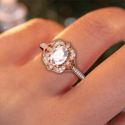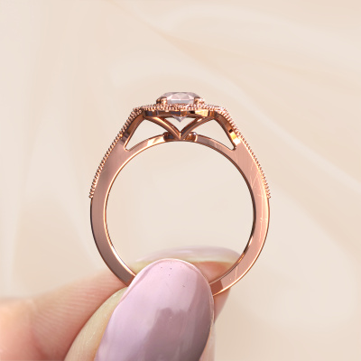 Deze verlovingsring heeft de naam Loni. Deze verlovingsring uitgevoerd in 14 Carat rosé goud is gezet met 7,5x5,5 mm morganiet champagne. Deze filigraan rosé gouden verlovingsring is een meesterwerkje op zich. Een prachtig ontwerp van verfijnde draadjes die een uniek geheel vormen. Tegelijkertijd een mooie uitdaging voor onze gepassioneerd goudsmeden! Met veel toewijding, geduld en uiterste precisie vervaardigen zij deze verlovingsring speciaal voor jouw geliefde. Alles wordt met de hand gemaakt, waardoor ieder draadje tot in het kleinste detail perfect bewerkt kan worden. Een lang proces van smeden, bewerken en polijsten, totdat de meestersmid de verlovingsring in het licht houdt en tevreden is... een perfecte verlovingsring waar hij echt trots op is. Daarom is deze vintage filigraan verlovingsring ook een bijzondere verlovingsring om te schenken aan de liefde van je leven! Die ene persoon ga jij binnenkort vragen, en alleen voor deze persoon is deze unieke verlovingsring voor vervaardigd! Prachtig toch? Dit juweel wordt met passie en liefde gemaakt door één van onze meestergoudsmeden.Omdat wij zelf alle verlovingsring maken en direct aan jou leveren kunnen wij je een verlovingsring leveren tegen een prijs die je nergens anders zult tegenkomen. Een ring wordt pas gemaakt als we een bestelling krijgen, hierdoor hebben wij geen dure voorraden en kunnen wij je de beste prijs garanderen. Wij begrijpen dat het kopen van een verlovingsring online spannend is en willen daarom je zoveel mogelijk informeren over alle specifieke eigenschappen van de ring die jij koopt.Ons team is iedere dag weer bezig om nieuwe ontwerpen toe te voegen, in samenwerking met onze designers en goudsmeden wordt gekeken hoe we tot het mooiste ontwerp kunnen komen. Wij doen ons best om tot een zo gevarieerd mogelijk aanbod te komen. Wellicht heb je zelf al een mooi idee van een sieraad dat je ooit wel eens gezien hebt. Neem dan eens vrijblijvend contact met ons op. Wij maken een offerte voor je op waarbij wij vrij zeker zijn dat we wat betreft kwaliteit en prijs jou versteld zullen laten staan.Om het voor jou makkelijker te maken kun je ieder besteld sieraad binnen 30 dagen na aflevering eenvoudig weer retour sturen.
