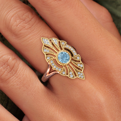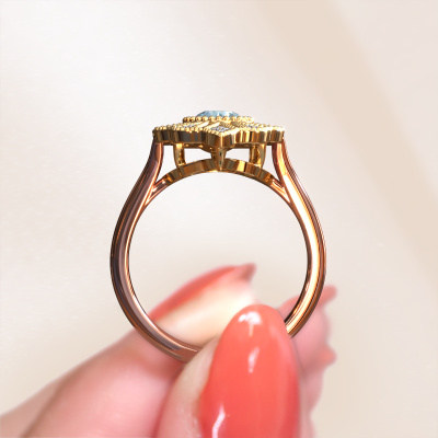 Deze verlovingsring heeft de naam Hanna. Deze verlovingsring uitgevoerd in 14 Carat rosé goud is gezet met 5 mm blauwe lab grown diamant. Deze filigraan rosé gouden verlovingsring is een meesterwerkje op zich. Een prachtig ontwerp van verfijnde draadjes die een uniek geheel vormen. Tegelijkertijd een mooie uitdaging voor onze gepassioneerd goudsmeden! Met veel toewijding, geduld en uiterste precisie vervaardigen zij deze verlovingsring speciaal voor jouw geliefde. Alles wordt met de hand gemaakt, waardoor ieder draadje tot in het kleinste detail perfect bewerkt kan worden. Een lang proces van smeden, bewerken en polijsten, totdat de meestersmid de verlovingsring in het licht houdt en tevreden is... een perfecte verlovingsring waar hij echt trots op is. Daarom is deze vintage filigraan verlovingsring ook een bijzondere verlovingsring om te schenken aan de liefde van je leven! Die ene persoon ga jij binnenkort vragen, en alleen voor deze persoon is deze unieke verlovingsring voor vervaardigd! Prachtig toch? Dit juweel is gemaakt om aan je vinger te stralen, ieder sieraad wordt met liefde door onze goudsmeden met de hand gemaakt.Wist je dat we een beste prijs garantie geven voor jouw verlovingsring? Dit is mogelijk omdat al onze sieraden met de hand gemaakt worden in ons eigen atelier. We hebben geen dure voorraden, en we maken pas je verlovingsring op het moment dat je besteld hebt. Doordat we de hele productie zelf in de hand hebben, kunnen wij je goed informeren over alle eigenschappen van deze ring. Juist omdat het kopen van een verlovingsring online spannend is, begrijpen wij dat het fijn is om alle kenmerken te weten van jouw ring.Ons team is iedere dag weer bezig om nieuwe ontwerpen toe te voegen, in samenwerking met onze designers en goudsmeden wordt gekeken hoe we tot het mooiste ontwerp kunnen komen. Wij doen ons best om tot een zo gevarieerd mogelijk aanbod te komen. Wellicht heb je zelf al een mooi idee van een sieraad dat je ooit wel eens gezien hebt. Neem dan eens vrijblijvend contact met ons op. Wij maken een offerte voor je op waarbij wij vrij zeker zijn dat we wat betreft kwaliteit en prijs jou versteld zullen laten staan.Om het voor jou makkelijker te maken kun je ieder besteld sieraad binnen 30 dagen na aflevering eenvoudig weer retour sturen.