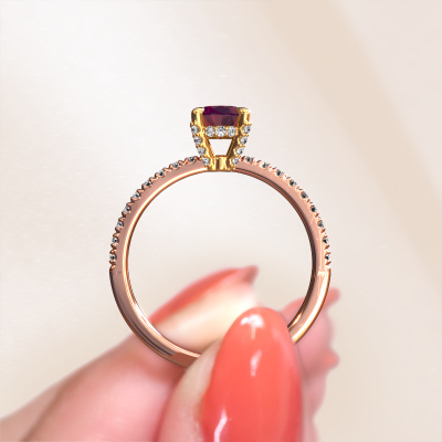 De naam van deze verlovingsring is de Saskia 1 ovl. Hij is gemaakt van 14 Carat rosé goud en gezet met 7x5 mm rhodoliet. Houdt je vriendin van accessoires met een exclusieve uitstraling? Of wil jij haar graag laten zien dat zij alleen het mooiste juweel verdient? In deze rosé gouden verlovingsring smelten ambachtelijk vakmanschap, liefde en passie samen met de modernste technieken. Het vraagt een geoefend oog, geduld en een vaardige hand om deze verlovingsring tot in de kleinste details perfect samen te stellen. Maar daar gaan onze goudsmeden dan ook absoluut voor! De zetting van deze zorgvuldig geselecteerde rhodoliet geeft de rosé gouden gedurfde verlovingsring extra allure. De stijl kun je verder aanpassen naar de smaak van jouw vriendin, door een keuze uit diverse edelmetalen en edelstenen. Op die manier creëer jij een unieke verlovingsring voor de meest exclusieve vrouw in jouw leven! Dit juweel is gemaakt door een team van gedreven goudsmeden en designers. Hierdoor zal dit unieke pronkstuk een echte eyecatcher zijn.Wist je dat we een beste prijs garantie geven voor jouw verlovingsring? Dit is mogelijk omdat al onze sieraden met de hand gemaakt worden in ons eigen atelier. We hebben geen dure voorraden, en we maken pas je verlovingsring op het moment dat je besteld hebt. Doordat we de hele productie zelf in de hand hebben, kunnen wij je goed informeren over alle eigenschappen van deze ring. Juist omdat het kopen van een verlovingsring online spannend is, begrijpen wij dat het fijn is om alle kenmerken te weten van jouw ring.Ons team ontwerpt dagelijks nieuwe ringen in diverse stijlen. Heb je zelf een pavé solitaire verlovingsring ergens gezien, die jij het liefst aan jouw geliefde zou willen geven? Je kunt altijd jouw ideeën en ontwerp met onze sieradenontwerpers bespreken, want wij zetten graag jouw ontwerp om tot een luxe verlovingsring. Je kunt tijdens het ontwerpproces steeds meekijken, omdat het ontwerp in een zeer gedetailleerde 3D tekening wordt omgezet. Daarbij kun je een dummy bestellen van het uiteindelijke ontwerp. Een dummy is een kunststof ring, die precies dezelfde vormen heeft als jouw uiteindelijke ontwerp. Je kunt deze passen en zien of de ontworpen verlovingsring helemaal naar jouw wens is. Wij sturen je graag een vrijblijvende offerte, waarbij je ongetwijfeld versteld zult staan over de prijs en de kwaliteit van de ring en edelstenen.Om het voor jou makkelijker te maken kun je ieder besteld sieraad binnen 30 dagen na aflevering eenvoudig weer retour sturen.