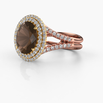 Bovenstaande verlovingsring heeft de naam Elvie. Dit type verlovingsring noemen we een halo ring. De verlovingsring is uitgevoerd in 14 Carat rosé goud en heeft als middensteen een ovale rookkwarts ter grootte van 10x8 mm en eromheen zijn kleine lab-grown diamanten gezet. Het bijzondere van deze vintage rosé gouden pavé solitaire verlovingsring zijn de kleinere edelstenen die rondom de grote rookkwarts zijn gezet. Dat is ook waar deze mooie verlovingsring zijn naam door heeft gekregen: pavé solitaire betekent lichtkrans en dat is ook waar de kleinere edelstenen voor zorgen. Deze kleinere edelstenen moeten dan echter wel allen op dezelfde manier geplaatst zijn, zodat het licht niet doorbroken wordt in de rookkwarts en er inderdaad een prachtige lichtkrans gecreëerd wordt. En daar zorgen onze meestergoudsmeden voor. Met uiterste precisie wordt iedere zorgvuldig geselecteerde rookkwarts met de hand in de verlovingsring geplaatst. Steeds opnieuw wordt de verlovingsring tegen het licht gehouden om te zien of het speciale effect nog steeds zichtbaar is. Het resultaat is een unieke verlovingsring, waarbij de gekozen rookkwarts letterlijk het stralende middelpunt wordt. Je kunt je voorstellen dat deze verlovingsring werkelijk een betekenisvolle verlovingsring is om aan jouw liefde voor het leven te schenken! Op de dag dat jij laat zien dat zij jouw stralende middelpunt is!Door onze modernste technieken kunnen wij met uiterste precisie prachtige sieraden te ontwerpen en voor jou personaliseren in de hoogste juwelierskwaliteit. Tegelijkertijd zijn onze verlovingsringen altijd 30% goedkoper dan bij een andere juwelier. Dit komt doordat alle verlovingsringen pas vervaardigd worden op het moment dat deze besteld wordt en we daardoor geen dure voorraden hoeven te hanteren. Mocht je aan een bepaald budget gebonden zijn, kunnen we je graag adviseren welke combinatie je het beste kunt kiezen.Heb je zelf een speciale ring in gedachten, die je wellicht ergens gezien hebt? Je kunt je ideeën altijd met ons bespreken, wij zetten graag jouw ontwerp om tot een unieke verlovingsring. Het ontwerp kun je volgen, omdat wij met 3D tekeningen werken. Hierdoor krijg je al een realistische indruk van hoe jouw ontwerp er in het echt uit komt te zien. Wij sturen je graag een vrijblijvende offerte, waarbij je ongetwijfeld verwonderd zult zijn over de prijs in combinatie met de uitstekende kwaliteit die we aanbieden.Om het voor jou makkelijker te maken kun je ieder besteld sieraad binnen 30 dagen na aflevering eenvoudig weer retour sturen.