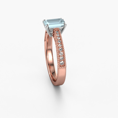 Deze verlovingsring heeft de naam Shonta EME. Deze verlovingsring uitgevoerd in 14 Carat rosé goud is gezet met aquamarijn. Een bijzondere rosé gouden vintage ring, deze unieke verlovingsring die jouw liefde van je leven zeker laat stralen! En dat is precies waar wij voor gaan. In deze vintage verlovingsring zijn prachtige aquamarijn verwerkt. Je kunt natuurlijk iedere edelsteen die wij aanbieden hierin laten verwerken. De edelsteen is zorgvuldig geselecteerd, want wij vinden dat op jouw verlovingsring alleen de mooiste edelsteen mag schitteren, toch? Onze goudsmid vervaardigt jouw verlovingsring in ons eigen atelier, en plaatst de aquamarijn met uiterste precisie in de ring. Vervolgens wordt deze bijgewerkt en gepolijst totdat het resultaat zichtbaar is: de perfecte verlovingsring voor de liefde van jouw leven! Dit juweel is gemaakt door een team van gedreven goudsmeden en designers. Hierdoor zal dit unieke pronkstuk een echte eyecatcher zijn.Wellicht is het je opgevallen dat onze prijzen gemiddeld 30% lager liggen dan bij een andere juwelier. En dat terwijl de kwaliteit in de meeste gevallen nog beter is! Dit komt doordat onze goudsmeden je verlovingsring direct in ons eigen atelier vervaardigen. Hierdoor hoeven we geen dure voorraden te hanteren en kunnen we ieder gewenst detail direct op jouw verlovingsring aanbrengen.Heb je zelf een specifieke verlovingsring ergens gezien, die je graag aan jouw geliefde zou willen geven? Bespreek gerust jouw ideeën met onze sieradenontwerpers, want wij zetten graag jouw ontwerp om tot een vintage verlovingsring. Je kunt tijdens het ontwerpproces steeds meekijken, omdat wij met 3D tekeningen werken. Je krijgt hierdoor al een realistische indruk van hoe jouw ontwerp er in werkelijkheid uit komt te zien. Daarbij kun je een dummy vooraf bestellen. Een dummy is een kunststof ring, die precies dezelfde vormen heeft als jouw uiteindelijke ontwerp. Je kunt deze passen en zien of de breedte en dikte bijvoorbeeld naar wens zijn. Wij sturen je graag een vrijblijvende offerte, waarbij je ongetwijfeld versteld zult staan over de prijs en de kwaliteit van de ring en edelstenen.Om het voor jou makkelijker te maken kun je ieder besteld sieraad binnen 30 dagen na aflevering eenvoudig weer retour sturen.