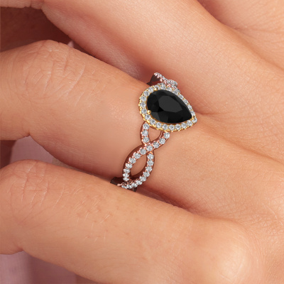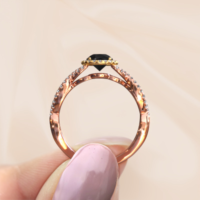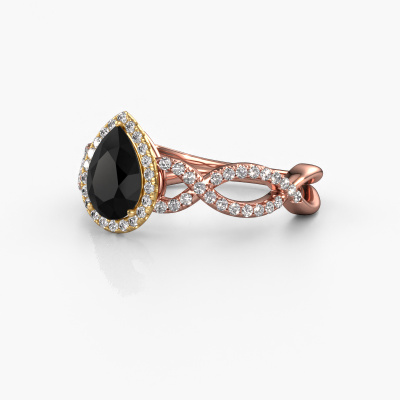 De naam van deze verlovingsring is de Dionne pear. Hij is gemaakt van 14 Carat rosé goud en gezet met 1.00 crt zwarte diamant. Houdt je vriendin van accessoires met een exclusieve uitstraling? Of wil jij haar graag laten zien dat zij alleen het mooiste juweel verdient? In deze rosé gouden verlovingsring smelten ambachtelijk vakmanschap, liefde en passie samen met de modernste technieken. Het vraagt een geoefend oog, geduld en een vaardige hand om deze verlovingsring tot in de kleinste details perfect samen te stellen. Maar daar gaan onze goudsmeden dan ook absoluut voor! De zetting van deze zorgvuldig geselecteerde zwarte diamanten geeft de rosé gouden twist verlovingsring extra allure. De stijl kun je verder aanpassen naar de smaak van jouw vriendin, door een keuze uit diverse edelmetalen en edelstenen. Op die manier creëer jij een unieke verlovingsring voor de meest exclusieve vrouw in jouw leven! Dit juweel is gemaakt om aan je vinger te stralen, ieder sieraad wordt met liefde door onze goudsmeden met de hand gemaakt.Wellicht is het je opgevallen dat onze prijzen gemiddeld 30% lager liggen dan bij een andere juwelier. En dat terwijl de kwaliteit in de meeste gevallen nog beter is! Dit komt doordat onze goudsmeden je verlovingsring direct in ons eigen atelier vervaardigen. Hierdoor hoeven we geen dure voorraden te hanteren en kunnen we ieder gewenst detail direct op jouw verlovingsring aanbrengen.Ons team ontwerpt dagelijks nieuwe ringen in diverse stijlen. Heb je zelf een pavé solitaire verlovingsring ergens gezien, die jij het liefst aan jouw geliefde zou willen geven? Je kunt altijd jouw ideeën en ontwerp met onze sieradenontwerpers bespreken, want wij zetten graag jouw ontwerp om tot een exclusieve verlovingsring. Je kunt tijdens het ontwerpproces steeds meekijken, omdat het ontwerp in een zeer gedetailleerde 3D tekening wordt omgezet. Daarbij kun je een dummy bestellen van het uiteindelijke ontwerp. Een dummy is een kunststof ring, die precies dezelfde vormen heeft als jouw uiteindelijke ontwerp. Je kunt deze passen en zien of de ontworpen verlovingsring helemaal naar jouw wens is. Wij sturen je graag een vrijblijvende offerte, waarbij je ongetwijfeld versteld zult staan over de prijs en de kwaliteit van de ring en edelstenen.Om het voor jou makkelijker te maken kun je ieder besteld sieraad binnen 30 dagen na aflevering eenvoudig weer retour sturen.