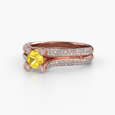 De naam van deze verlovingsring is de Stefanie 2. Hij is gemaakt van 14 Carat rosé goud en gezet met 5 mm gele saffier. Houdt je vriendin van accessoires met een exclusieve uitstraling? Of wil jij haar graag laten zien dat zij alleen het mooiste juweel verdient? In deze rosé gouden verlovingsring smelten ambachtelijk vakmanschap, liefde en passie samen met de modernste technieken. Het vraagt een geoefend oog, geduld en een vaardige hand om deze verlovingsring tot in de kleinste details perfect samen te stellen. Maar daar gaan onze goudsmeden dan ook absoluut voor! De zetting van deze zorgvuldig geselecteerde gele saffier geeft de rosé gouden gespleten banden verlovingsring extra allure. De stijl kun je verder aanpassen naar de smaak van jouw vriendin, door een keuze uit diverse edelmetalen en edelstenen. Op die manier creëer jij een unieke verlovingsring voor de meest exclusieve vrouw in jouw leven! Dit juweel wordt speciaal voor jou gemaakt door onze meester goudsmeden in ons eigen atelier.Wist je dat we een beste prijs garantie geven voor jouw verlovingsring? Dit is mogelijk omdat al onze sieraden met de hand gemaakt worden in ons eigen atelier. We hebben geen dure voorraden, en we maken pas je verlovingsring op het moment dat je besteld hebt. Doordat we de hele productie zelf in de hand hebben, kunnen wij je goed informeren over alle eigenschappen van deze ring. Juist omdat het kopen van een verlovingsring online spannend is, begrijpen wij dat het fijn is om alle kenmerken te weten van jouw ring.Ons team ontwerpt dagelijks nieuwe ringen in diverse stijlen. Heb je zelf een pavé solitaire verlovingsring ergens gezien, die jij het liefst aan jouw geliefde zou willen geven? Je kunt altijd jouw ideeën en ontwerp met onze sieradenontwerpers bespreken, want wij zetten graag jouw ontwerp om tot een unieke verlovingsring. Je kunt tijdens het ontwerpproces steeds meekijken, omdat het ontwerp in een zeer gedetailleerde 3D tekening wordt omgezet. Daarbij kun je een dummy bestellen van het uiteindelijke ontwerp. Een dummy is een kunststof ring, die precies dezelfde vormen heeft als jouw uiteindelijke ontwerp. Je kunt deze passen en zien of de ontworpen verlovingsring helemaal naar jouw wens is. Wij sturen je graag een vrijblijvende offerte, waarbij je ongetwijfeld versteld zult staan over de prijs en de kwaliteit van de ring en edelstenen.Om het voor jou makkelijker te maken kun je ieder besteld sieraad binnen 30 dagen na aflevering eenvoudig weer retour sturen.