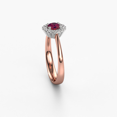 Bovenstaande verlovingsring heeft de naam Debi. Dit type verlovingsring noemen we een halo ring. De verlovingsring is uitgevoerd in 14 Carat rosé goud en heeft als middensteen een ronde rhodoliet ter grootte van 4.2 mm en eromheen zijn kleine diamanten gezet. Het bijzondere van deze klassieke rosé gouden halo verlovingsring zijn de kleinere edelstenen die rondom de grote rhodoliet zijn gezet. Dat is ook waar deze mooie verlovingsring zijn naam door heeft gekregen: halo betekent lichtkrans en dat is ook waar de kleinere edelstenen voor zorgen. Deze kleinere edelstenen moeten dan echter wel allen op dezelfde manier geplaatst zijn, zodat het licht niet doorbroken wordt in de rhodoliet en er inderdaad een prachtige lichtkrans gecreëerd wordt. En daar zorgen onze meestergoudsmeden voor. Met uiterste precisie wordt iedere zorgvuldig geselecteerde rhodoliet met de hand in de verlovingsring geplaatst. Steeds opnieuw wordt de verlovingsring tegen het licht gehouden om te zien of het speciale effect nog steeds zichtbaar is. Het resultaat is een unieke verlovingsring, waarbij de gekozen rhodoliet letterlijk het stralende middelpunt wordt. Je kunt je voorstellen dat deze verlovingsring werkelijk een betekenisvolle verlovingsring is om aan jouw liefde voor het leven te schenken! Op de dag dat jij laat zien dat zij jouw stralende middelpunt is!Omdat wij zelf alle verlovingsring maken en direct aan jou leveren kunnen wij je een verlovingsring leveren tegen een prijs die je nergens anders zult tegenkomen. Een ring wordt pas gemaakt als we een bestelling krijgen, hierdoor hebben wij geen dure voorraden en kunnen wij je de beste prijs garanderen. Wij begrijpen dat het kopen van een verlovingsring online spannend is en willen daarom je zoveel mogelijk informeren over alle specifieke eigenschappen van de ring die jij koopt.Ons team is iedere dag weer bezig om nieuwe ontwerpen toe te voegen, in samenwerking met onze designers en goudsmeden wordt gekeken hoe we tot het mooiste ontwerp kunnen komen. Wij doen ons best om tot een zo gevarieerd mogelijk aanbod te komen. Wellicht heb je zelf al een mooi idee van een sieraad dat je ooit wel eens gezien hebt. Neem dan eens vrijblijvend contact met ons op. Wij maken een offerte voor je op waarbij wij vrij zeker zijn dat we wat betreft kwaliteit en prijs jou versteld zullen laten staan.Om het voor jou makkelijker te maken kun je ieder besteld sieraad binnen 30 dagen na aflevering eenvoudig weer retour sturen.