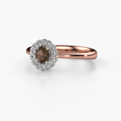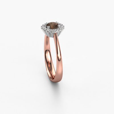Bovenstaande verlovingsring heeft de naam Debi. Dit type verlovingsring noemen we een halo ring. De verlovingsring is uitgevoerd in 14 Carat rosé goud en heeft als middensteen een ronde rookkwarts ter grootte van 4.2 mm en eromheen zijn kleine diamanten gezet. Het bijzondere van deze klassieke rosé gouden halo verlovingsring zijn de kleinere edelstenen die rondom de grote rookkwarts zijn gezet. Dat is ook waar deze mooie verlovingsring zijn naam door heeft gekregen: halo betekent lichtkrans en dat is ook waar de kleinere edelstenen voor zorgen. Deze kleinere edelstenen moeten dan echter wel allen op dezelfde manier geplaatst zijn, zodat het licht niet doorbroken wordt in de rookkwarts en er inderdaad een prachtige lichtkrans gecreëerd wordt. En daar zorgen onze meestergoudsmeden voor. Met uiterste precisie wordt iedere zorgvuldig geselecteerde rookkwarts met de hand in de verlovingsring geplaatst. Steeds opnieuw wordt de verlovingsring tegen het licht gehouden om te zien of het speciale effect nog steeds zichtbaar is. Het resultaat is een unieke verlovingsring, waarbij de gekozen rookkwarts letterlijk het stralende middelpunt wordt. Je kunt je voorstellen dat deze verlovingsring werkelijk een betekenisvolle verlovingsring is om aan jouw liefde voor het leven te schenken! Op de dag dat jij laat zien dat zij jouw stralende middelpunt is!Omdat wij zelf alle verlovingsring maken en direct aan jou leveren kunnen wij je een verlovingsring leveren tegen een prijs die je nergens anders zult tegenkomen. Een ring wordt pas gemaakt als we een bestelling krijgen, hierdoor hebben wij geen dure voorraden en kunnen wij je de beste prijs garanderen. Wij begrijpen dat het kopen van een verlovingsring online spannend is en willen daarom je zoveel mogelijk informeren over alle specifieke eigenschappen van de ring die jij koopt.Ons team is iedere dag weer bezig om nieuwe ontwerpen toe te voegen, in samenwerking met onze designers en goudsmeden wordt gekeken hoe we tot het mooiste ontwerp kunnen komen. Wij doen ons best om tot een zo gevarieerd mogelijk aanbod te komen. Wellicht heb je zelf al een mooi idee van een sieraad dat je ooit wel eens gezien hebt. Neem dan eens vrijblijvend contact met ons op. Wij maken een offerte voor je op waarbij wij vrij zeker zijn dat we wat betreft kwaliteit en prijs jou versteld zullen laten staan.Om het voor jou makkelijker te maken kun je ieder besteld sieraad binnen 30 dagen na aflevering eenvoudig weer retour sturen.