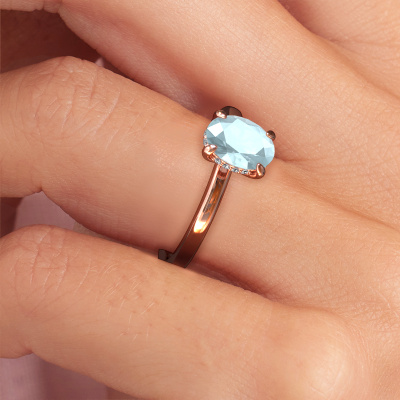 Deze verlovingsring heeft de naam Simone OVL 2. Deze ring, uitgevoerd in 14 Carat rosé goud is gezet met aquamarijn. Ben je op zoek naar een unieke rosé gouden verlovingsring met een eigentijdse uitstraling? Dan is dit een mooie ring, die je zelf naar jouw of haar smaak verder kunt aanpassen. In deze eigentijdse verlovingsring is prachtige aquamarijn verwerkt. Deze is zorgvuldig geselecteerd, want op jouw gracieuze verlovingsring mag alleen de mooiste edelsteen schitteren. Onze goudsmid vervaardigt jouw verlovingsring in ons eigen atelier, en plaatst de aquamarijn met uiterste precisie in de ring. Vervolgens wordt deze bijgewerkt en gepolijst totdat het resultaat zichtbaar is: de perfecte verlovingsring voor de liefde van jouw leven!Omdat wij zelf alle verlovingsring maken en direct aan jou leveren kunnen wij je een verlovingsring leveren tegen een prijs die je nergens anders zult tegenkomen. Een ring wordt pas gemaakt als we een bestelling krijgen, hierdoor hebben wij geen dure voorraden en kunnen wij je de beste prijs garanderen. Wij begrijpen dat het kopen van een verlovingsring online spannend is en willen daarom je zoveel mogelijk informeren over alle specifieke eigenschappen van de ring die jij koopt.Heb je zelf een speciale ring in gedachten, die je wellicht ergens gezien hebt? Je kunt je ideeën altijd met ons bespreken, wij zetten graag jouw ontwerp om tot een unieke verlovingsring. Het ontwerp kun je volgen, omdat wij met 3D tekeningen werken. Hierdoor krijg je al een realistische indruk van hoe jouw ontwerp er in het echt uit komt te zien. Wij sturen je graag een vrijblijvende offerte, waarbij je ongetwijfeld verwonderd zult zijn over de prijs in combinatie met de uitstekende kwaliteit die we aanbieden.Om het voor jou makkelijker te maken kun je ieder besteld sieraad binnen 30 dagen na aflevering eenvoudig weer retour sturen.