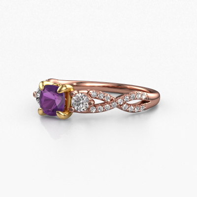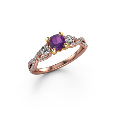 Bovenstaande verlovingsring heeft de naam Marilou CUS. Dit type verlovingsring noemen we een 3 steens verlovingsring omdat hij een enkele middensteen heeft waarbij de banden van de verlovingsring ook volgezet zijn. De verlovingsring is uitgevoerd in de combinatie 14 Carat rosé goud met goud en heeft als middensteen een cushion amethist ter grootte van 5 mm en in de zijbanden zijn diamanten gezet. Ieder juweel is uniek, doordat je deze ring geheel naar eigen wensen kunt samenstellen.Deze traditionele rosé gouden 3 steens verlovingsring heeft een schitterende cushion amethist als centersteen, waarbij in de band nog meer amethisten zijn gezet om de middensteen nog meer te accentueren. Doordat de zetting van de pootjes om de amethist open is, vangt de amethist het licht van alle kanten op en schittert hierdoor optimaal. Hierboven kun je zien hoe onze goudsmid de verlovingsring heel precies tot in de kleinste details heeft bewerkt, zodat de wat hoger gelegen amethist een echte eyecatcher is. Wat een prachtige verlovingsring om te geven bij je aanzoek aan de liefde van jouw leven, aan jouw stralende middelpunt!Door het gebruik van de modernste technieken, gecombineerd met ambachtelijk vakmanschap kunnen wij alle verlovingsringen zelf in ons atelier maken. Ieder sieraad wordt pas gemaakt nadat deze besteld is. Dit heeft als bijkomend voordeel dat we kunnen leveren tegen een prijs die je nergens anders tegenkomt.Ons team is iedere dag weer bezig om nieuwe ontwerpen toe te voegen, in samenwerking met onze designers en goudsmeden wordt gekeken hoe we tot het mooiste ontwerp kunnen komen. Wij doen ons best om tot een zo gevarieerd mogelijk aanbod te komen. Wellicht heb je zelf al een mooi idee van een sieraad dat je ooit wel eens gezien hebt. Neem dan eens vrijblijvend contact met ons op. Wij maken een offerte voor je op waarbij wij vrij zeker zijn dat we wat betreft kwaliteit en prijs jou versteld zullen laten staan.Om het voor jou makkelijker te maken kun je ieder besteld sieraad binnen 30 dagen na aflevering eenvoudig weer retour sturen.