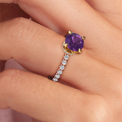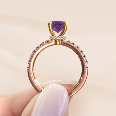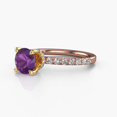 Bovenstaande verlovingsring heeft de naam Crystal rnd 4. Dit type verlovingsring noemen we een pavé solitaire verlovingsring omdat hij een enkele middensteen heeft waarbij de banden van de verlovingsring ook volgezet zijn. De verlovingsring is uitgevoerd in de combinatie 14 Carat rosé goud met goud en heeft als middensteen een ronde amethist ter grootte van 7 mm en in de zijbanden zijn lab-grown diamanten gezet. Ieder juweel is gemaakt om aan jouw vinger te stralen, ieder sieraad wordt met liefde door onze goudsmeden met de hand gemaakt.Deze fantasie rosé gouden pavé solitaire verlovingsring heeft een schitterende ronde amethist als centersteen, waarbij in de band nog meer amethisten zijn gezet om de middensteen nog meer te accentueren. Doordat de zetting van de pootjes om de amethist open is, vangt de amethist het licht van alle kanten op en schittert hierdoor optimaal. Hierboven kun je zien hoe onze goudsmid de verlovingsring heel precies tot in de kleinste details heeft bewerkt, zodat de wat hoger gelegen amethist een echte eyecatcher is. Wat een prachtige verlovingsring om te geven bij je aanzoek aan de liefde van jouw leven, aan jouw stralende middelpunt!Door onze modernste technieken kunnen wij met uiterste precisie prachtige sieraden te ontwerpen en voor jou personaliseren in de hoogste juwelierskwaliteit. Tegelijkertijd zijn onze verlovingsringen altijd 30% goedkoper dan bij een andere juwelier. Dit komt doordat alle verlovingsringen pas vervaardigd worden op het moment dat deze besteld wordt en we daardoor geen dure voorraden hoeven te hanteren. Mocht je aan een bepaald budget gebonden zijn, kunnen we je graag adviseren welke combinatie je het beste kunt kiezen.Heb je zelf een specifieke verlovingsring ergens gezien, die je graag aan jouw geliefde zou willen geven? Bespreek gerust jouw ideeën met onze sieradenontwerpers, want wij zetten graag jouw ontwerp om tot een fantasie verlovingsring. Je kunt tijdens het ontwerpproces steeds meekijken, omdat wij met 3D tekeningen werken. Je krijgt hierdoor al een realistische indruk van hoe jouw ontwerp er in werkelijkheid uit komt te zien. Daarbij kun je een dummy vooraf bestellen. Een dummy is een kunststof ring, die precies dezelfde vormen heeft als jouw uiteindelijke ontwerp. Je kunt deze passen en zien of de breedte en dikte bijvoorbeeld naar wens zijn. Wij sturen je graag een vrijblijvende offerte, waarbij je ongetwijfeld versteld zult staan over de prijs en de kwaliteit van de ring en edelstenen.Om het voor jou makkelijker te maken kun je ieder besteld sieraad binnen 30 dagen na aflevering eenvoudig weer retour sturen.