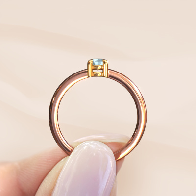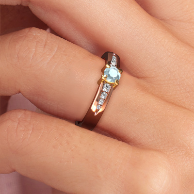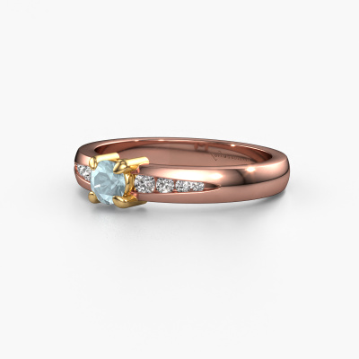 Bovenstaande verlovingsring heeft de naam Zohra. Dit type verlovingsring noemen we een pavé solitaire verlovingsring omdat hij een enkele middensteen heeft waarbij de banden van de verlovingsring ook volgezet zijn. De verlovingsring is uitgevoerd in de combinatie 14 Carat rosé goud met goud en heeft als middensteen een ronde aquamarijn ter grootte van 4 mm en in de zijbanden zijn diamanten gezet. Ieder juweel wordt speciaal voor jou gemaakt door onze meester goudsmeden in ons eigen atelier.Deze moderne rosé gouden pavé solitaire verlovingsring heeft een schitterende ronde aquamarijn als centersteen, waarbij in de band nog meer aquamarijn zijn gezet om de middensteen nog meer te accentueren. Doordat de zetting van de pootjes om de aquamarijn open is, vangt de aquamarijn het licht van alle kanten op en schittert hierdoor optimaal. Hierboven kun je zien hoe onze goudsmid de verlovingsring heel precies tot in de kleinste details heeft bewerkt, zodat de wat hoger gelegen aquamarijn een echte eyecatcher is. Wat een prachtige verlovingsring om te geven bij je aanzoek aan de liefde van jouw leven, aan jouw stralende middelpunt!Omdat wij zelf alle verlovingsring maken en direct aan jou leveren kunnen wij je een verlovingsring leveren tegen een prijs die je nergens anders zult tegenkomen. Een ring wordt pas gemaakt als we een bestelling krijgen, hierdoor hebben wij geen dure voorraden en kunnen wij je de beste prijs garanderen. Wij begrijpen dat het kopen van een verlovingsring online spannend is en willen daarom je zoveel mogelijk informeren over alle specifieke eigenschappen van de ring die jij koopt.Ons team is iedere dag weer bezig om nieuwe ontwerpen toe te voegen, in samenwerking met onze designers en goudsmeden wordt gekeken hoe we tot het mooiste ontwerp kunnen komen. Wij doen ons best om tot een zo gevarieerd mogelijk aanbod te komen. Wellicht heb je zelf al een mooi idee van een sieraad dat je ooit wel eens gezien hebt. Neem dan eens vrijblijvend contact met ons op. Wij maken een offerte voor je op waarbij wij vrij zeker zijn dat we wat betreft kwaliteit en prijs jou versteld zullen laten staan.Om het voor jou makkelijker te maken kun je ieder besteld sieraad binnen 30 dagen na aflevering eenvoudig weer retour sturen.