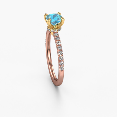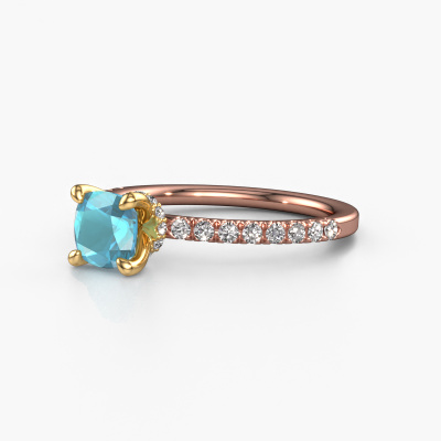 Bovenstaande verlovingsring heeft de naam Crystal CUS 4. Dit type verlovingsring noemen we een pavé solitaire verlovingsring omdat hij een enkele middensteen heeft waarbij de banden van de verlovingsring ook volgezet zijn. De verlovingsring is uitgevoerd in de combinatie 14 Carat rosé goud met goud en heeft als middensteen een cushion blauw topaas ter grootte van 5.5 mm en in de zijbanden zijn diamanten gezet. Ieder juweel is gemaakt om aan je vinger te stralen, ieder sieraad wordt met liefde door onze goudsmeden met de hand gemaakt.Deze chique rosé gouden pavé solitaire verlovingsring heeft een schitterende cushion blauw topaas als centersteen, waarbij in de band nog meer blauw topaas zijn gezet om de middensteen nog meer te accentueren. Doordat de zetting van de pootjes om de blauw topaas open is, vangt de blauw topaas het licht van alle kanten op en schittert hierdoor optimaal. Hierboven kun je zien hoe onze goudsmid de verlovingsring heel precies tot in de kleinste details heeft bewerkt, zodat de wat hoger gelegen blauw topaas een echte eyecatcher is. Wat een prachtige verlovingsring om te geven bij je aanzoek aan de liefde van jouw leven, aan jouw stralende middelpunt!Door onze modernste technieken kunnen wij met uiterste precisie prachtige sieraden te ontwerpen en voor jou personaliseren in de hoogste juwelierskwaliteit. Tegelijkertijd zijn onze verlovingsringen altijd 30% goedkoper dan bij een andere juwelier. Dit komt doordat alle verlovingsringen pas vervaardigd worden op het moment dat deze besteld wordt en we daardoor geen dure voorraden hoeven te hanteren. Mocht je aan een bepaald budget gebonden zijn, kunnen we je graag adviseren welke combinatie je het beste kunt kiezen.Heb je zelf een speciale ring in gedachten, die je wellicht ergens gezien hebt? Je kunt je ideeën altijd met ons bespreken, wij zetten graag jouw ontwerp om tot een unieke verlovingsring. Het ontwerp kun je volgen, omdat wij met 3D tekeningen werken. Hierdoor krijg je al een realistische indruk van hoe jouw ontwerp er in het echt uit komt te zien. Wij sturen je graag een vrijblijvende offerte, waarbij je ongetwijfeld verwonderd zult zijn over de prijs in combinatie met de uitstekende kwaliteit die we aanbieden.Om het voor jou makkelijker te maken kun je ieder besteld sieraad binnen 30 dagen na aflevering eenvoudig weer retour sturen.