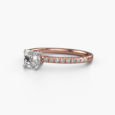 Bovenstaande verlovingsring heeft de naam Saskia 1 cus. Dit type verlovingsring noemen we een pavé solitaire verlovingsring omdat hij een enkele middensteen heeft waarbij de banden van de verlovingsring ook volgezet zijn. De verlovingsring is uitgevoerd in de combinatie 14 Carat rosé goud met witgoud en heeft als middensteen een cushion diamant ter grootte van 0.50 crt en in de zijbanden zijn diamanten gezet. Ieder juweel is gemaakt door een team van gedreven goudsmeden en designers. Hierdoor zal dit unieke pronkstuk een echte eyecatcher zijn.Deze unieke rosé gouden pavé solitaire verlovingsring heeft een schitterende cushion diamant als centersteen, waarbij in de band nog meer diamanten zijn gezet om de middensteen nog meer te accentueren. Doordat de zetting van de pootjes om de diamant open is, vangt de diamant het licht van alle kanten op en schittert hierdoor optimaal. Hierboven kun je zien hoe onze goudsmid de verlovingsring heel precies tot in de kleinste details heeft bewerkt, zodat de wat hoger gelegen diamant een echte eyecatcher is. Wat een prachtige verlovingsring om te geven bij je aanzoek aan de liefde van jouw leven, aan jouw stralende middelpunt!Door het gebruik van de modernste technieken, gecombineerd met ambachtelijk vakmanschap kunnen wij alle verlovingsringen zelf in ons atelier maken. Ieder sieraad wordt pas gemaakt nadat deze besteld is. Dit heeft als bijkomend voordeel dat we kunnen leveren tegen een prijs die je nergens anders tegenkomt.Ons team is iedere dag weer bezig om nieuwe ontwerpen toe te voegen, in samenwerking met onze designers en goudsmeden wordt gekeken hoe we tot het mooiste ontwerp kunnen komen. Wij doen ons best om tot een zo gevarieerd mogelijk aanbod te komen. Wellicht heb je zelf al een mooi idee van een sieraad dat je ooit wel eens gezien hebt. Neem dan eens vrijblijvend contact met ons op. Wij maken een offerte voor je op waarbij wij vrij zeker zijn dat we wat betreft kwaliteit en prijs jou versteld zullen laten staan.Om het voor jou makkelijker te maken kun je ieder besteld sieraad binnen 30 dagen na aflevering eenvoudig weer retour sturen.