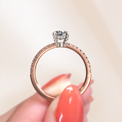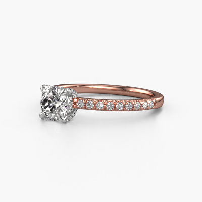 Bovenstaande verlovingsring heeft de naam Saskia rnd 1. Dit type verlovingsring noemen we een pavé solitaire verlovingsring omdat hij een enkele middensteen heeft waarbij de banden van de verlovingsring ook volgezet zijn. De verlovingsring is uitgevoerd in de combinatie 14 Carat rosé goud met witgoud en heeft als middensteen een ronde diamant ter grootte van 0.60 crt en in de zijbanden zijn lab-grown diamanten gezet. Ieder juweel wordt met passie en liefde gemaakt door één van onze meestergoudsmeden.Deze exclusieve rosé gouden pavé solitaire verlovingsring heeft een schitterende ronde diamant als centersteen, waarbij in de band nog meer diamanten zijn gezet om de middensteen nog meer te accentueren. Doordat de zetting van de pootjes om de diamant open is, vangt de diamant het licht van alle kanten op en schittert hierdoor optimaal. Hierboven kun je zien hoe onze goudsmid de verlovingsring heel precies tot in de kleinste details heeft bewerkt, zodat de wat hoger gelegen diamant een echte eyecatcher is. Wat een prachtige verlovingsring om te geven bij je aanzoek aan de liefde van jouw leven, aan jouw stralende middelpunt!Door het gebruik van de modernste technieken, gecombineerd met ambachtelijk vakmanschap kunnen wij alle verlovingsringen zelf in ons atelier maken. Ieder sieraad wordt pas gemaakt nadat deze besteld is. Dit heeft als bijkomend voordeel dat we kunnen leveren tegen een prijs die je nergens anders tegenkomt.Heb je zelf een speciale ring in gedachten, die je wellicht ergens gezien hebt? Je kunt je ideeën altijd met ons bespreken, wij zetten graag jouw ontwerp om tot een unieke verlovingsring. Het ontwerp kun je volgen, omdat wij met 3D tekeningen werken. Hierdoor krijg je al een realistische indruk van hoe jouw ontwerp er in het echt uit komt te zien. Wij sturen je graag een vrijblijvende offerte, waarbij je ongetwijfeld verwonderd zult zijn over de prijs in combinatie met de uitstekende kwaliteit die we aanbieden.Om het voor jou makkelijker te maken kun je ieder besteld sieraad binnen 30 dagen na aflevering eenvoudig weer retour sturen.