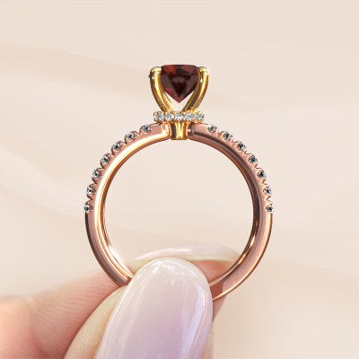 Bovenstaande verlovingsring heeft de naam Crystal rnd 4. Dit type verlovingsring noemen we een pavé solitaire verlovingsring omdat hij een enkele middensteen heeft waarbij de banden van de verlovingsring ook volgezet zijn. De verlovingsring is uitgevoerd in de combinatie 14 Carat rosé goud met goud en heeft als middensteen een ronde granaat ter grootte van 7 mm en in de zijbanden zijn lab-grown diamanten gezet. Ieder juweel is gemaakt om aan jouw vinger te stralen, ieder sieraad wordt met liefde door onze goudsmeden met de hand gemaakt.Deze fantasie rosé gouden pavé solitaire verlovingsring heeft een schitterende ronde granaat als centersteen, waarbij in de band nog meer granaat zijn gezet om de middensteen nog meer te accentueren. Doordat de zetting van de pootjes om de granaat open is, vangt de granaat het licht van alle kanten op en schittert hierdoor optimaal. Hierboven kun je zien hoe onze goudsmid de verlovingsring heel precies tot in de kleinste details heeft bewerkt, zodat de wat hoger gelegen granaat een echte eyecatcher is. Wat een prachtige verlovingsring om te geven bij je aanzoek aan de liefde van jouw leven, aan jouw stralende middelpunt!Door onze modernste technieken kunnen wij met uiterste precisie prachtige sieraden te ontwerpen en voor jou personaliseren in de hoogste juwelierskwaliteit. Tegelijkertijd zijn onze verlovingsringen altijd 30% goedkoper dan bij een andere juwelier. Dit komt doordat alle verlovingsringen pas vervaardigd worden op het moment dat deze besteld wordt en we daardoor geen dure voorraden hoeven te hanteren. Mocht je aan een bepaald budget gebonden zijn, kunnen we je graag adviseren welke combinatie je het beste kunt kiezen.Heb je zelf een specifieke verlovingsring ergens gezien, die je graag aan jouw geliefde zou willen geven? Bespreek gerust jouw ideeën met onze sieradenontwerpers, want wij zetten graag jouw ontwerp om tot een fantasie verlovingsring. Je kunt tijdens het ontwerpproces steeds meekijken, omdat wij met 3D tekeningen werken. Je krijgt hierdoor al een realistische indruk van hoe jouw ontwerp er in werkelijkheid uit komt te zien. Daarbij kun je een dummy vooraf bestellen. Een dummy is een kunststof ring, die precies dezelfde vormen heeft als jouw uiteindelijke ontwerp. Je kunt deze passen en zien of de breedte en dikte bijvoorbeeld naar wens zijn. Wij sturen je graag een vrijblijvende offerte, waarbij je ongetwijfeld versteld zult staan over de prijs en de kwaliteit van de ring en edelstenen.Om het voor jou makkelijker te maken kun je ieder besteld sieraad binnen 30 dagen na aflevering eenvoudig weer retour sturen.