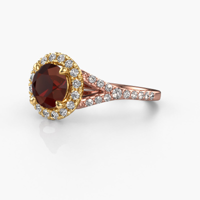 Bovenstaande verlovingsring heeft de naam Kimber RND. Dit type verlovingsring noemen we een pavé solitaire verlovingsring omdat hij een enkele middensteen heeft waarbij de banden van de verlovingsring ook volgezet zijn. De verlovingsring is uitgevoerd in de combinatie 14 Carat rosé goud met goud en heeft als middensteen een ronde granaat ter grootte van 7 mm en in de zijbanden zijn lab-grown diamanten gezet. Ieder juweel is gemaakt om aan je vinger te stralen, ieder sieraad wordt met liefde door onze goudsmeden met de hand gemaakt.Deze klassieke rosé gouden pavé solitaire verlovingsring heeft een schitterende ronde granaat als centersteen, waarbij in de band nog meer granaat zijn gezet om de middensteen nog meer te accentueren. Doordat de zetting van de pootjes om de granaat open is, vangt de granaat het licht van alle kanten op en schittert hierdoor optimaal. Hierboven kun je zien hoe onze goudsmid de verlovingsring heel precies tot in de kleinste details heeft bewerkt, zodat de wat hoger gelegen granaat een echte eyecatcher is. Wat een prachtige verlovingsring om te geven bij je aanzoek aan de liefde van jouw leven, aan jouw stralende middelpunt!Wist je dat we een beste prijs garantie geven voor jouw verlovingsring? Dit is mogelijk omdat al onze sieraden met de hand gemaakt worden in ons eigen atelier. We hebben geen dure voorraden, en we maken pas je verlovingsring op het moment dat je besteld hebt. Doordat we de hele productie zelf in de hand hebben, kunnen wij je goed informeren over alle eigenschappen van deze ring. Juist omdat het kopen van een verlovingsring online spannend is, begrijpen wij dat het fijn is om alle kenmerken te weten van jouw ring.Ons team is iedere dag weer bezig om nieuwe ontwerpen toe te voegen, in samenwerking met onze designers en goudsmeden wordt gekeken hoe we tot het mooiste ontwerp kunnen komen. Wij doen ons best om tot een zo gevarieerd mogelijk aanbod te komen. Wellicht heb je zelf al een mooi idee van een sieraad dat je ooit wel eens gezien hebt. Neem dan eens vrijblijvend contact met ons op. Wij maken een offerte voor je op waarbij wij vrij zeker zijn dat we wat betreft kwaliteit en prijs jou versteld zullen laten staan.Om het voor jou makkelijker te maken kun je ieder besteld sieraad binnen 30 dagen na aflevering eenvoudig weer retour sturen.