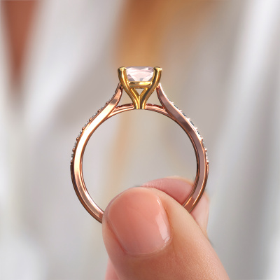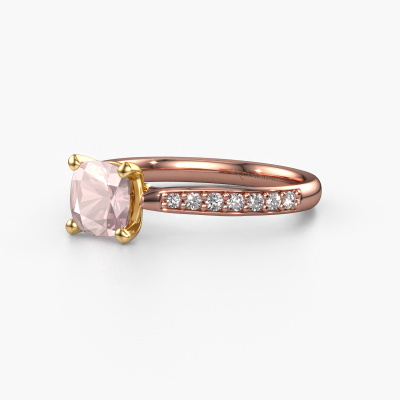 Bovenstaande verlovingsring heeft de naam Mignon cus 2. Dit type verlovingsring noemen we een pavé solitaire verlovingsring omdat hij een enkele middensteen heeft waarbij de banden van de verlovingsring ook volgezet zijn. De verlovingsring is uitgevoerd in de combinatie 14 Carat rosé goud met goud en heeft als middensteen een cushion morganiet champagne ter grootte van 6 mm en in de zijbanden zijn lab-grown diamanten gezet. Ieder juweel wordt met passie en liefde gemaakt door één van onze meestergoudsmeden.Deze exclusieve rosé gouden pavé solitaire verlovingsring heeft een schitterende cushion morganiet champagne als centersteen, waarbij in de band nog meer morganiet champagne zijn gezet om de middensteen nog meer te accentueren. Doordat de zetting van de pootjes om de morganiet champagne open is, vangt de morganiet champagne het licht van alle kanten op en schittert hierdoor optimaal. Hierboven kun je zien hoe onze goudsmid de verlovingsring heel precies tot in de kleinste details heeft bewerkt, zodat de wat hoger gelegen morganiet champagne een echte eyecatcher is. Wat een prachtige verlovingsring om te geven bij je aanzoek aan de liefde van jouw leven, aan jouw stralende middelpunt!Onze goudsmeden vervaardigen pas je Mignon cus 2 verlovingsring, zodra je deze besteld hebt. We hebben geen voorraden. Het voordeel hiervan is dat we de voorraad niet door hoeven te berekenen in de prijs, en kunnen daardoor sieraden leveren tegen een bijzonder lage prijs.Ons team is iedere dag weer bezig om nieuwe ontwerpen toe te voegen, in samenwerking met onze designers en goudsmeden wordt gekeken hoe we tot het mooiste ontwerp kunnen komen. Wij doen ons best om tot een zo gevarieerd mogelijk aanbod te komen. Wellicht heb je zelf al een mooi idee van een sieraad dat je ooit wel eens gezien hebt. Neem dan eens vrijblijvend contact met ons op. Wij maken een offerte voor je op waarbij wij vrij zeker zijn dat we wat betreft kwaliteit en prijs jou versteld zullen laten staan.Om het voor jou makkelijker te maken kun je ieder besteld sieraad binnen 30 dagen na aflevering eenvoudig weer retour sturen.