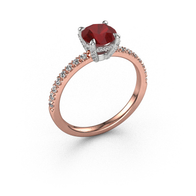 Bovenstaande verlovingsring heeft de naam Saskia rnd 1. Dit type verlovingsring noemen we een pavé solitaire verlovingsring omdat hij een enkele middensteen heeft waarbij de banden van de verlovingsring ook volgezet zijn. De verlovingsring is uitgevoerd in de combinatie 14 Carat rosé goud met witgoud en heeft als middensteen een ronde robijn ter grootte van 6.5 mm en in de zijbanden zijn lab-grown diamanten gezet. Ieder juweel wordt met passie en liefde gemaakt door één van onze meestergoudsmeden.Deze exclusieve rosé gouden pavé solitaire verlovingsring heeft een schitterende ronde robijn als centersteen, waarbij in de band nog meer robijn zijn gezet om de middensteen nog meer te accentueren. Doordat de zetting van de pootjes om de robijn open is, vangt de robijn het licht van alle kanten op en schittert hierdoor optimaal. Hierboven kun je zien hoe onze goudsmid de verlovingsring heel precies tot in de kleinste details heeft bewerkt, zodat de wat hoger gelegen robijn een echte eyecatcher is. Wat een prachtige verlovingsring om te geven bij je aanzoek aan de liefde van jouw leven, aan jouw stralende middelpunt!Door het gebruik van de modernste technieken, gecombineerd met ambachtelijk vakmanschap kunnen wij alle verlovingsringen zelf in ons atelier maken. Ieder sieraad wordt pas gemaakt nadat deze besteld is. Dit heeft als bijkomend voordeel dat we kunnen leveren tegen een prijs die je nergens anders tegenkomt.Heb je zelf een speciale ring in gedachten, die je wellicht ergens gezien hebt? Je kunt je ideeën altijd met ons bespreken, wij zetten graag jouw ontwerp om tot een unieke verlovingsring. Het ontwerp kun je volgen, omdat wij met 3D tekeningen werken. Hierdoor krijg je al een realistische indruk van hoe jouw ontwerp er in het echt uit komt te zien. Wij sturen je graag een vrijblijvende offerte, waarbij je ongetwijfeld verwonderd zult zijn over de prijs in combinatie met de uitstekende kwaliteit die we aanbieden.Om het voor jou makkelijker te maken kun je ieder besteld sieraad binnen 30 dagen na aflevering eenvoudig weer retour sturen.