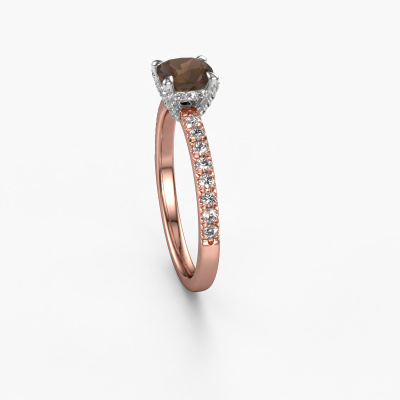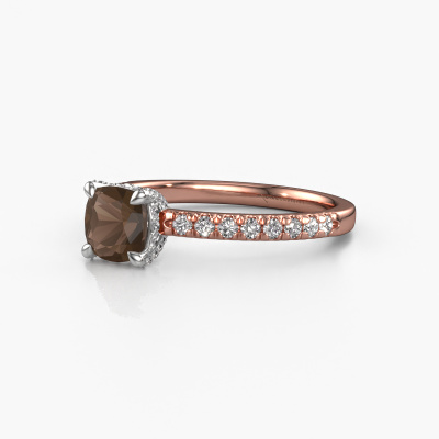 Bovenstaande verlovingsring heeft de naam Saskia 1 cus. Dit type verlovingsring noemen we een pavé solitaire verlovingsring omdat hij een enkele middensteen heeft waarbij de banden van de verlovingsring ook volgezet zijn. De verlovingsring is uitgevoerd in de combinatie 14 Carat rosé goud met witgoud en heeft als middensteen een cushion rookkwarts ter grootte van 5.5 mm en in de zijbanden zijn diamanten gezet. Ieder juweel is gemaakt door een team van gedreven goudsmeden en designers. Hierdoor zal dit unieke pronkstuk een echte eyecatcher zijn.Deze unieke rosé gouden pavé solitaire verlovingsring heeft een schitterende cushion rookkwarts als centersteen, waarbij in de band nog meer rookkwarts zijn gezet om de middensteen nog meer te accentueren. Doordat de zetting van de pootjes om de rookkwarts open is, vangt de rookkwarts het licht van alle kanten op en schittert hierdoor optimaal. Hierboven kun je zien hoe onze goudsmid de verlovingsring heel precies tot in de kleinste details heeft bewerkt, zodat de wat hoger gelegen rookkwarts een echte eyecatcher is. Wat een prachtige verlovingsring om te geven bij je aanzoek aan de liefde van jouw leven, aan jouw stralende middelpunt!Door het gebruik van de modernste technieken, gecombineerd met ambachtelijk vakmanschap kunnen wij alle verlovingsringen zelf in ons atelier maken. Ieder sieraad wordt pas gemaakt nadat deze besteld is. Dit heeft als bijkomend voordeel dat we kunnen leveren tegen een prijs die je nergens anders tegenkomt.Ons team is iedere dag weer bezig om nieuwe ontwerpen toe te voegen, in samenwerking met onze designers en goudsmeden wordt gekeken hoe we tot het mooiste ontwerp kunnen komen. Wij doen ons best om tot een zo gevarieerd mogelijk aanbod te komen. Wellicht heb je zelf al een mooi idee van een sieraad dat je ooit wel eens gezien hebt. Neem dan eens vrijblijvend contact met ons op. Wij maken een offerte voor je op waarbij wij vrij zeker zijn dat we wat betreft kwaliteit en prijs jou versteld zullen laten staan.Om het voor jou makkelijker te maken kun je ieder besteld sieraad binnen 30 dagen na aflevering eenvoudig weer retour sturen.