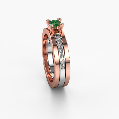 Bovenstaande verlovingsring heeft de naam Alisha. Dit type verlovingsring noemen we een pavé solitaire verlovingsring omdat hij een enkele middensteen heeft waarbij de banden van de verlovingsring ook volgezet zijn. De verlovingsring is uitgevoerd in de combinatie 14 Carat rosé goud met witgoud en heeft als middensteen een ronde smaragd ter grootte van 4 mm en in de zijbanden zijn diamanten gezet. Ieder juweel is uniek, doordat je deze ring geheel naar eigen wensen kunt samenstellen.Deze design rosé gouden pavé solitaire verlovingsring heeft een schitterende ronde smaragd als centersteen, waarbij in de band nog meer smaragd zijn gezet om de middensteen nog meer te accentueren. Doordat de zetting van de pootjes om de smaragd open is, vangt de smaragd het licht van alle kanten op en schittert hierdoor optimaal. Hierboven kun je zien hoe onze goudsmid de verlovingsring heel precies tot in de kleinste details heeft bewerkt, zodat de wat hoger gelegen smaragd een echte eyecatcher is. Wat een prachtige verlovingsring om te geven bij je aanzoek aan de liefde van jouw leven, aan jouw stralende middelpunt!Door het gebruik van de modernste technieken, gecombineerd met ambachtelijk vakmanschap kunnen wij alle verlovingsringen zelf in ons atelier maken. Ieder sieraad wordt pas gemaakt nadat deze besteld is. Dit heeft als bijkomend voordeel dat we kunnen leveren tegen een prijs die je nergens anders tegenkomt.Heb je zelf een specifieke verlovingsring ergens gezien, die je graag aan jouw geliefde zou willen geven? Bespreek gerust jouw ideeën met onze sieradenontwerpers, want wij zetten graag jouw ontwerp om tot een design verlovingsring. Je kunt tijdens het ontwerpproces steeds meekijken, omdat wij met 3D tekeningen werken. Je krijgt hierdoor al een realistische indruk van hoe jouw ontwerp er in werkelijkheid uit komt te zien. Daarbij kun je een dummy vooraf bestellen. Een dummy is een kunststof ring, die precies dezelfde vormen heeft als jouw uiteindelijke ontwerp. Je kunt deze passen en zien of de breedte en dikte bijvoorbeeld naar wens zijn. Wij sturen je graag een vrijblijvende offerte, waarbij je ongetwijfeld versteld zult staan over de prijs en de kwaliteit van de ring en edelstenen.Om het voor jou makkelijker te maken kun je ieder besteld sieraad binnen 30 dagen na aflevering eenvoudig weer retour sturen.
