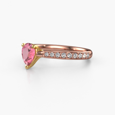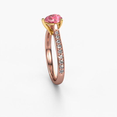 Bovenstaande verlovingsring heeft de naam Mignon per 2. Dit type verlovingsring noemen we een pavé solitaire verlovingsring omdat hij een enkele middensteen heeft waarbij de banden van de verlovingsring ook volgezet zijn. De verlovingsring is uitgevoerd in de combinatie 14 Carat rosé goud met goud en heeft als middensteen een peer tourmalijn pink ter grootte van 6.5x4.5 mm en in de zijbanden zijn diamanten gezet. Ieder juweel wordt speciaal voor jou gemaakt door onze meester goudsmeden in ons eigen atelier.Deze trendy rosé gouden pavé solitaire verlovingsring heeft een schitterende peer tourmalijn pink als centersteen, waarbij in de band nog meer tourmalijn pink zijn gezet om de middensteen nog meer te accentueren. Doordat de zetting van de pootjes om de tourmalijn pink open is, vangt de tourmalijn pink het licht van alle kanten op en schittert hierdoor optimaal. Hierboven kun je zien hoe onze goudsmid de verlovingsring heel precies tot in de kleinste details heeft bewerkt, zodat de wat hoger gelegen tourmalijn pink een echte eyecatcher is. Wat een prachtige verlovingsring om te geven bij je aanzoek aan de liefde van jouw leven, aan jouw stralende middelpunt!Wellicht is het je opgevallen dat onze prijzen gemiddeld 30% lager liggen dan bij een andere juwelier. En dat terwijl de kwaliteit in de meeste gevallen nog beter is! Dit komt doordat onze goudsmeden je verlovingsring direct in ons eigen atelier vervaardigen. Hierdoor hoeven we geen dure voorraden te hanteren en kunnen we ieder gewenst detail direct op jouw verlovingsring aanbrengen.Ons team is iedere dag weer bezig om nieuwe ontwerpen toe te voegen, in samenwerking met onze designers en goudsmeden wordt gekeken hoe we tot het mooiste ontwerp kunnen komen. Wij doen ons best om tot een zo gevarieerd mogelijk aanbod te komen. Wellicht heb je zelf al een mooi idee van een sieraad dat je ooit wel eens gezien hebt. Neem dan eens vrijblijvend contact met ons op. Wij maken een offerte voor je op waarbij wij vrij zeker zijn dat we wat betreft kwaliteit en prijs jou versteld zullen laten staan.Om het voor jou makkelijker te maken kun je ieder besteld sieraad binnen 30 dagen na aflevering eenvoudig weer retour sturen.
