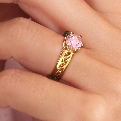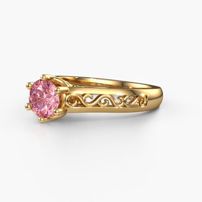 Bovenstaande verlovingsring heeft de naam Shan, dit type verlovingsring noemen we een solitaire ring omdat hij een enkele edelsteen bevat. De verlovingsring is uitgevoerd in 14 Carat goud en heeft een ronde roze lab grown diamant ter grootte van 6 mm. Het leuke van onze configurator is dat je zelf je juweel kunt samenstellen tot een eigen persoonlijk juweel. Deze solitaire ring is uitgevoerd in de edelmetaal combinatie goud met goud, maar u kunt dus ook uit andere kleuren kiezen. Ieder juweel is gemaakt door een team van gedreven goudsmeden en designers. Hierdoor zal dit unieke pronkstuk een echte eyecatcher zijn.De solitaire verlovingsring is een bijzondere verlovingsring. Juist doordat de chatonzetting open is, creëert de lichtinval een schitterend effect op de edelsteen. Omdat de gekozen edelsteen hoog op de verlovingsring geplaatst wordt, wordt deze Keltische verlovingsring een prachtige eyecatcher. Met veel zorgvuldigheid vervaardigen wij alle details in deze solitaire verlovingsring met de hand, zodat jij binnenkort je aanzoek kunt bekronen met een unieke ring, speciaal voor de liefde van jouw leven!Door onze modernste technieken kunnen wij met uiterste precisie prachtige sieraden te ontwerpen en voor jou personaliseren in de hoogste juwelierskwaliteit. Tegelijkertijd zijn onze verlovingsringen altijd 30% goedkoper dan bij een andere juwelier. Dit komt doordat alle verlovingsringen pas vervaardigd worden op het moment dat deze besteld wordt en we daardoor geen dure voorraden hoeven te hanteren. Mocht je aan een bepaald budget gebonden zijn, kunnen we je graag adviseren welke combinatie je het beste kunt kiezen.Heb je zelf een specifieke verlovingsring ergens gezien, die je graag aan jouw geliefde zou willen geven? Bespreek gerust jouw ideeën met onze sieradenontwerpers, want wij zetten graag jouw ontwerp om tot een Keltische verlovingsring. Je kunt tijdens het ontwerpproces steeds meekijken, omdat wij met 3D tekeningen werken. Je krijgt hierdoor al een realistische indruk van hoe jouw ontwerp er in werkelijkheid uit komt te zien. Daarbij kun je een dummy vooraf bestellen. Een dummy is een kunststof ring, die precies dezelfde vormen heeft als jouw uiteindelijke ontwerp. Je kunt deze passen en zien of de breedte en dikte bijvoorbeeld naar wens zijn. Wij sturen je graag een vrijblijvende offerte, waarbij je ongetwijfeld versteld zult staan over de prijs en de kwaliteit van de ring en edelstenen.Om het voor jou makkelijker te maken kun je ieder besteld sieraad binnen 30 dagen na aflevering eenvoudig weer retour sturen.