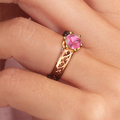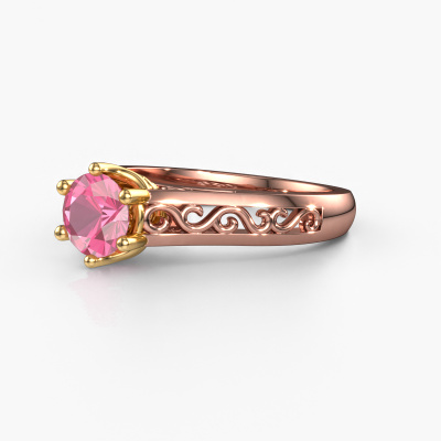 Bovenstaande verlovingsring heeft de naam Shan, dit type verlovingsring noemen we een solitaire ring omdat hij een enkele edelsteen bevat. De verlovingsring is uitgevoerd in 14 Carat rosé goud en heeft een ronde roze saffier ter grootte van 6 mm. Het leuke van onze configurator is dat je zelf je juweel kunt samenstellen tot een eigen persoonlijk juweel. Deze solitaire ring is uitgevoerd in de edelmetaal combinatie rosé goud met goud, maar u kunt dus ook uit andere kleuren kiezen. Ieder juweel is gemaakt door een team van gedreven goudsmeden en designers. Hierdoor zal dit unieke pronkstuk een echte eyecatcher zijn.De solitaire verlovingsring is een bijzondere verlovingsring. Juist doordat de chatonzetting open is, creëert de lichtinval een schitterend effect op de edelsteen. Omdat de gekozen edelsteen hoog op de verlovingsring geplaatst wordt, wordt deze Keltische verlovingsring een prachtige eyecatcher. Met veel zorgvuldigheid vervaardigen wij alle details in deze solitaire verlovingsring met de hand, zodat jij binnenkort je aanzoek kunt bekronen met een unieke ring, speciaal voor de liefde van jouw leven!Door onze modernste technieken kunnen wij met uiterste precisie prachtige sieraden te ontwerpen en voor jou personaliseren in de hoogste juwelierskwaliteit. Tegelijkertijd zijn onze verlovingsringen altijd 30% goedkoper dan bij een andere juwelier. Dit komt doordat alle verlovingsringen pas vervaardigd worden op het moment dat deze besteld wordt en we daardoor geen dure voorraden hoeven te hanteren. Mocht je aan een bepaald budget gebonden zijn, kunnen we je graag adviseren welke combinatie je het beste kunt kiezen.Heb je zelf een specifieke verlovingsring ergens gezien, die je graag aan jouw geliefde zou willen geven? Bespreek gerust jouw ideeën met onze sieradenontwerpers, want wij zetten graag jouw ontwerp om tot een Keltische verlovingsring. Je kunt tijdens het ontwerpproces steeds meekijken, omdat wij met 3D tekeningen werken. Je krijgt hierdoor al een realistische indruk van hoe jouw ontwerp er in werkelijkheid uit komt te zien. Daarbij kun je een dummy vooraf bestellen. Een dummy is een kunststof ring, die precies dezelfde vormen heeft als jouw uiteindelijke ontwerp. Je kunt deze passen en zien of de breedte en dikte bijvoorbeeld naar wens zijn. Wij sturen je graag een vrijblijvende offerte, waarbij je ongetwijfeld versteld zult staan over de prijs en de kwaliteit van de ring en edelstenen.Om het voor jou makkelijker te maken kun je ieder besteld sieraad binnen 30 dagen na aflevering eenvoudig weer retour sturen.
