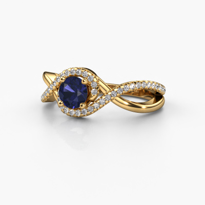 Bovenstaande verlovingsring heeft de naam Melody. Dit type verlovingsring noemen we een pavé solitaire verlovingsring omdat hij een enkele middensteen heeft waarbij de banden van de verlovingsring ook volgezet zijn. Deze verlovingsring is uitgevoerd in 14 Carat goud en heeft als middensteen een ronde saffier ter grootte van 5 mm, en in de zijbanden zijn diamanten gezet. Ieder juweel is uniek, doordat je deze ring geheel naar eigen wensen kunt samenstellen.. Deze klassieke gouden pavé solitaire verlovingsring heeft een schitterende ronde saffier als center steen, waarbij in de band nog meer diamanten zijn gezet om de middensteen nog meer te accentueren. Doordat de zetting van de pootjes om de saffier open is, vangt de saffier het licht van alle kanten op en schittert hierdoor optimaal. Hierboven kun je zien hoe onze goudsmid de verlovingsring heel precies tot in de kleinste details heeft bewerkt, zodat de wat hoger gelegen saffier een echte eyecatcher is. Wat een prachtige verlovingsring om te geven bij je aanzoek aan de liefde van jouw leven, aan jouw stralende middelpunt!Omdat wij zelf alle verlovingsring maken en direct aan jou leveren kunnen wij je een verlovingsring leveren tegen een prijs die je nergens anders zult tegenkomen. Een ring wordt pas gemaakt als we een bestelling krijgen, hierdoor hebben wij geen dure voorraden en kunnen wij je de beste prijs garanderen. Wij begrijpen dat het kopen van een verlovingsring online spannend is en willen daarom je zoveel mogelijk informeren over alle specifieke eigenschappen van de ring die jij koopt.Heb je zelf een speciale ring in gedachten, die je wellicht ergens gezien hebt? Je kunt je ideeën altijd met ons bespreken, wij zetten graag jouw ontwerp om tot een unieke verlovingsring. Het ontwerp kun je volgen, omdat wij met 3D tekeningen werken. Hierdoor krijg je al een realistische indruk van hoe jouw ontwerp er in het echt uit komt te zien. Wij sturen je graag een vrijblijvende offerte, waarbij je ongetwijfeld verwonderd zult zijn over de prijs in combinatie met de uitstekende kwaliteit die we aanbieden.Om het voor jou makkelijker te maken kun je ieder besteld sieraad binnen 30 dagen na aflevering eenvoudig weer retour sturen.