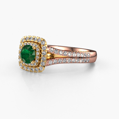 Bovenstaande verlovingsring heeft de naam Annette. Dit type verlovingsring noemen we een halo verlovingsring omdat hij een enkele middensteen heeft waarbij de banden van de verlovingsring ook volgezet zijn. De verlovingsring is uitgevoerd in de combinatie 14 Carat rosé goud met goud en heeft als middensteen een ronde smaragd ter grootte van 5 mm en in de zijbanden zijn diamanten gezet. Ieder juweel wordt speciaal voor jou gemaakt door onze meester goudsmeden in ons eigen atelier.Deze vintage rosé gouden halo verlovingsring heeft een schitterende ronde smaragd als centersteen, waarbij in de band nog meer smaragd zijn gezet om de middensteen nog meer te accentueren. Doordat de zetting van de pootjes om de smaragd open is, vangt de smaragd het licht van alle kanten op en schittert hierdoor optimaal. Hierboven kun je zien hoe onze goudsmid de verlovingsring heel precies tot in de kleinste details heeft bewerkt, zodat de wat hoger gelegen smaragd een echte eyecatcher is. Wat een prachtige verlovingsring om te geven bij je aanzoek aan de liefde van jouw leven, aan jouw stralende middelpunt!Wist je dat we een beste prijs garantie geven voor jouw verlovingsring? Dit is mogelijk omdat al onze sieraden met de hand gemaakt worden in ons eigen atelier. We hebben geen dure voorraden, en we maken pas je verlovingsring op het moment dat je besteld hebt. Doordat we de hele productie zelf in de hand hebben, kunnen wij je goed informeren over alle eigenschappen van deze ring. Juist omdat het kopen van een verlovingsring online spannend is, begrijpen wij dat het fijn is om alle kenmerken te weten van jouw ring.Heb je zelf een specifieke verlovingsring ergens gezien, die je graag aan jouw geliefde zou willen geven? Bespreek gerust jouw ideeën met onze sieradenontwerpers, want wij zetten graag jouw ontwerp om tot een vintage verlovingsring. Je kunt tijdens het ontwerpproces steeds meekijken, omdat wij met 3D tekeningen werken. Je krijgt hierdoor al een realistische indruk van hoe jouw ontwerp er in werkelijkheid uit komt te zien. Daarbij kun je een dummy vooraf bestellen. Een dummy is een kunststof ring, die precies dezelfde vormen heeft als jouw uiteindelijke ontwerp. Je kunt deze passen en zien of de breedte en dikte bijvoorbeeld naar wens zijn. Wij sturen je graag een vrijblijvende offerte, waarbij je ongetwijfeld versteld zult staan over de prijs en de kwaliteit van de ring en edelstenen.Om het voor jou makkelijker te maken kun je ieder besteld sieraad binnen 30 dagen na aflevering eenvoudig weer retour sturen.