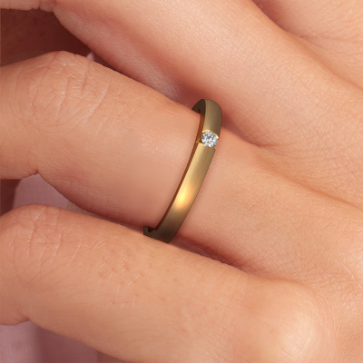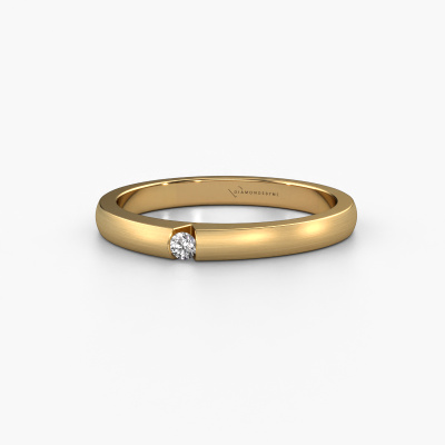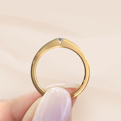 Deze verlovingsring heeft de naam Theresia. De verlovingsring is uitgevoerd in 14 Carat goud is gezet met diamant 0.03 crt. Het bijzondere van deze verlovingsring met een spanzetting is dat de aandacht echt naar de diamant getrokken wordt. Onze goudsmid maakt bij het vervaardigen van deze verlovingsring gebruik van speciale technieken, waardoor de diamant ingeklemd wordt door de gouden ring. Hierdoor heeft het licht veel vrij spel op de edelsteen, dat zorgt voor een prachtige schittering en allure. Een prachtig staaltje vakmanschap! Het resultaat is een unieke ring, met een moderne uitstraling, gepassioneerd met de hand gemaakt door onze goudsmid, speciaal voor de liefde van jouw leven! Wij raden voor deze verlovingsring een wat hardere steen aan, zoals een diamant omdat er door de spanning grote krachten op de edelsteen komen te staan. Dit sieraad wordt speciaal voor jou gemaakt door onze meester goudsmeden in ons eigen atelier.Door onze modernste technieken kunnen wij met uiterste precisie prachtige sieraden te ontwerpen en voor jou personaliseren in de hoogste juwelierskwaliteit. Tegelijkertijd zijn onze verlovingsringen altijd 30% goedkoper dan bij een andere juwelier. Dit komt doordat alle verlovingsringen pas vervaardigd worden op het moment dat deze besteld wordt en we daardoor geen dure voorraden hoeven te hanteren. Mocht je aan een bepaald budget gebonden zijn, kunnen we je graag adviseren welke combinatie je het beste kunt kiezen.Ons team ontwerpt dagelijks nieuwe ringen in diverse stijlen. Heb je zelf een solitaire verlovingsring ergens gezien, die jij het liefst aan jouw geliefde zou willen geven? Je kunt altijd jouw ideeën en ontwerp met onze sieradenontwerpers bespreken, want wij zetten graag jouw ontwerp om tot een moderne verlovingsring. Je kunt tijdens het ontwerpproces steeds meekijken, omdat het ontwerp in een zeer gedetailleerde 3D tekening wordt omgezet. Daarbij kun je een dummy bestellen van het uiteindelijke ontwerp. Een dummy is een kunststof ring, die precies dezelfde vormen heeft als jouw uiteindelijke ontwerp. Je kunt deze passen en zien of de ontworpen verlovingsring helemaal naar jouw wens is. Wij sturen je graag een vrijblijvende offerte, waarbij je ongetwijfeld versteld zult staan over de prijs en de kwaliteit van de ring en edelstenen.Om het voor jou makkelijker te maken kun je ieder besteld sieraad binnen 30 dagen na aflevering eenvoudig weer retour sturen.