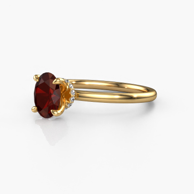 Bovenstaande verlovingsring heeft de naam Crystal OVL 3, dit type verlovingsring noemen we een solitaire ring omdat hij een enkele edelsteen bevat. De verlovingsring is uitgevoerd in 14 Carat goud en heeft een ovale granaat ter grootte van 7,5x5,5 mm. Deze unieke gouden solitaire ring met een schitterende ovale granaat is een prachtige verlovingsring. Doordat de chatonzetting open is, is de lichtinval op de edelsteen optimaal. Ook plaatsen we de edelsteen hoog op de ring, waardoor deze extra opvalt. De diamant is bijvoorbeeld een prachtige edelsteen om aan de liefde van je leven te schenken, omdat deze symbool staat voor eeuwige liefde en zuiverheid. En dit symbool straalt midden op deze solitaire ring. Zo heeft iedere edelsteen een mooie symbolische betekenis. Deze solitaire verlovingsring kunt u zelf samenstellen in verschillende edelmetaal combinaties. Deze heeft de combinatie 14 Carat goud met goud. Ieder juweel wordt speciaal voor jou gemaakt door onze meester goudsmeden in ons eigen atelier.Wist je dat we een beste prijs garantie geven voor jouw verlovingsring? Dit is mogelijk omdat al onze sieraden met de hand gemaakt worden in ons eigen atelier. We hebben geen dure voorraden, en we maken pas je verlovingsring op het moment dat je besteld hebt. Doordat we de hele productie zelf in de hand hebben, kunnen wij je goed informeren over alle eigenschappen van deze ring. Juist omdat het kopen van een verlovingsring online spannend is, begrijpen wij dat het fijn is om alle kenmerken te weten van jouw ring.Iedere dag is ons team van goudsmeden en sieradenontwerpers aan het werk om nieuwe sieraden te creëren. Het kan zijn dat je ergens een unieke verlovingsring gezien hebt, die je als basis wilt nemen bij het ontwerpen van jouw unieke ring. Neem gerust contact met ons op en we zullen je een aanbod doen, waar je vrijwel zeker verwonderd zult zijn over de kwaliteit en de prijs.Om het voor jou makkelijker te maken kun je ieder besteld sieraad binnen 30 dagen na aflevering eenvoudig weer retour sturen.