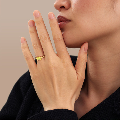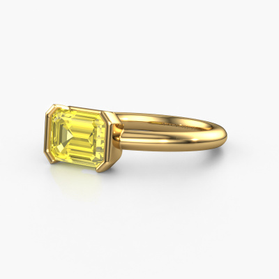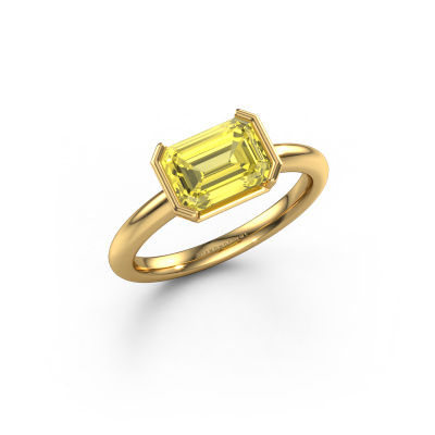 Bovenstaande verlovingsring heeft de naam Tayler EME, dit type verlovingsring noemen we een solitaire ring omdat hij een enkele edelsteen bevat. De verlovingsring is uitgevoerd in 14 Carat goud en heeft een smaragd geslepen gele lab grown diamant ter grootte van 8x6 mm. Deze moderne gouden solitaire ring met een schitterende smaragd geslepen gele lab grown diamant is een prachtige verlovingsring. Doordat de chatonzetting open is, is de lichtinval op de edelsteen optimaal. Ook plaatsen we de edelsteen hoog op de ring, waardoor deze extra opvalt. De diamant is bijvoorbeeld een prachtige edelsteen om aan de liefde van je leven te schenken, omdat deze symbool staat voor eeuwige liefde en zuiverheid. En dit symbool straalt midden op deze solitaire ring. Zo heeft iedere edelsteen een mooie symbolische betekenis. Deze solitaire verlovingsring kunt u zelf samenstellen in verschillende edelmetaal combinaties. Deze heeft de combinatie 14 Carat goud met goud. Ieder juweel is gemaakt om aan je vinger te stralen, ieder sieraad wordt met liefde door onze goudsmeden met de hand gemaakt.Wist je dat we een beste prijs garantie geven voor jouw verlovingsring? Dit is mogelijk omdat al onze sieraden met de hand gemaakt worden in ons eigen atelier. We hebben geen dure voorraden, en we maken pas je verlovingsring op het moment dat je besteld hebt. Doordat we de hele productie zelf in de hand hebben, kunnen wij je goed informeren over alle eigenschappen van deze ring. Juist omdat het kopen van een verlovingsring online spannend is, begrijpen wij dat het fijn is om alle kenmerken te weten van jouw ring.Iedere dag is ons team van goudsmeden en sieradenontwerpers aan het werk om nieuwe sieraden te creëren. Het kan zijn dat je ergens een moderne verlovingsring gezien hebt, die je als basis wilt nemen bij het ontwerpen van jouw unieke ring. Neem gerust contact met ons op en we zullen je een aanbod doen, waar je vrijwel zeker verwonderd zult zijn over de kwaliteit en de prijs.Om het voor jou makkelijker te maken kun je ieder besteld sieraad binnen 30 dagen na aflevering eenvoudig weer retour sturen.