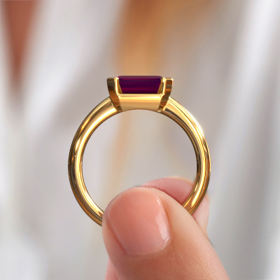 Bovenstaande verlovingsring heeft de naam Tayler EME, dit type verlovingsring noemen we een solitaire ring omdat hij een enkele edelsteen bevat. De verlovingsring is uitgevoerd in 14 Carat goud en heeft een smaragd geslepen rhodoliet ter grootte van 8x6 mm. Deze moderne gouden solitaire ring met een schitterende smaragd geslepen rhodoliet is een prachtige verlovingsring. Doordat de chatonzetting open is, is de lichtinval op de edelsteen optimaal. Ook plaatsen we de edelsteen hoog op de ring, waardoor deze extra opvalt. De diamant is bijvoorbeeld een prachtige edelsteen om aan de liefde van je leven te schenken, omdat deze symbool staat voor eeuwige liefde en zuiverheid. En dit symbool straalt midden op deze solitaire ring. Zo heeft iedere edelsteen een mooie symbolische betekenis. Deze solitaire verlovingsring kunt u zelf samenstellen in verschillende edelmetaal combinaties. Deze heeft de combinatie 14 Carat goud met goud. Ieder juweel is gemaakt om aan je vinger te stralen, ieder sieraad wordt met liefde door onze goudsmeden met de hand gemaakt.Wist je dat we een beste prijs garantie geven voor jouw verlovingsring? Dit is mogelijk omdat al onze sieraden met de hand gemaakt worden in ons eigen atelier. We hebben geen dure voorraden, en we maken pas je verlovingsring op het moment dat je besteld hebt. Doordat we de hele productie zelf in de hand hebben, kunnen wij je goed informeren over alle eigenschappen van deze ring. Juist omdat het kopen van een verlovingsring online spannend is, begrijpen wij dat het fijn is om alle kenmerken te weten van jouw ring.Iedere dag is ons team van goudsmeden en sieradenontwerpers aan het werk om nieuwe sieraden te creëren. Het kan zijn dat je ergens een moderne verlovingsring gezien hebt, die je als basis wilt nemen bij het ontwerpen van jouw unieke ring. Neem gerust contact met ons op en we zullen je een aanbod doen, waar je vrijwel zeker verwonderd zult zijn over de kwaliteit en de prijs.Om het voor jou makkelijker te maken kun je ieder besteld sieraad binnen 30 dagen na aflevering eenvoudig weer retour sturen.