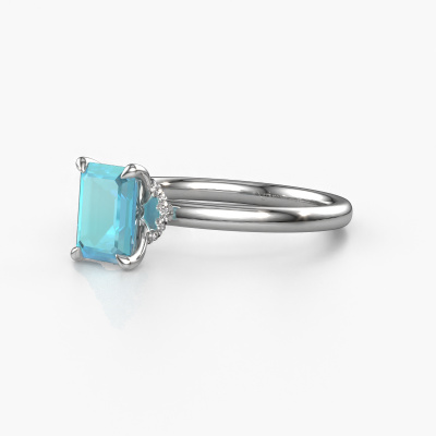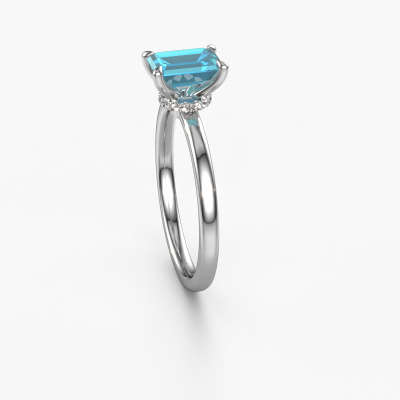 Bovenstaande verlovingsring heeft de naam Crystal EME 3, dit type verlovingsring noemen we een solitaire ring omdat hij een enkele edelsteen bevat. De verlovingsring is uitgevoerd in platina en heeft een smaragd geslepen blauw topaas ter grootte van 7x5 mm. Deze klassieke platina solitaire ring met een schitterende smaragd geslepen blauw topaas is een prachtige verlovingsring. Doordat de chatonzetting open is, is de lichtinval op de edelsteen optimaal. Ook plaatsen we de edelsteen hoog op de ring, waardoor deze extra opvalt. De diamant is bijvoorbeeld een prachtige edelsteen om aan de liefde van je leven te schenken, omdat deze symbool staat voor eeuwige liefde en zuiverheid. En dit symbool straalt midden op deze solitaire ring. Zo heeft iedere edelsteen een mooie symbolische betekenis. Deze solitaire verlovingsring kunt u zelf samenstellen in verschillende edelmetaal combinaties. Deze heeft de combinatie platina met platina. Ieder juweel is gemaakt door een team van gedreven goudsmeden en designers. Hierdoor zal dit unieke pronkstuk een echte eyecatcher zijn.Door onze modernste technieken kunnen wij met uiterste precisie prachtige sieraden te ontwerpen en voor jou personaliseren in de hoogste juwelierskwaliteit. Tegelijkertijd zijn onze verlovingsringen altijd 30% goedkoper dan bij een andere juwelier. Dit komt doordat alle verlovingsringen pas vervaardigd worden op het moment dat deze besteld wordt en we daardoor geen dure voorraden hoeven te hanteren. Mocht je aan een bepaald budget gebonden zijn, kunnen we je graag adviseren welke combinatie je het beste kunt kiezen.Heb je zelf een speciale ring in gedachten, die je wellicht ergens gezien hebt? Je kunt je ideeën altijd met ons bespreken, wij zetten graag jouw ontwerp om tot een unieke verlovingsring. Het ontwerp kun je volgen, omdat wij met 3D tekeningen werken. Hierdoor krijg je al een realistische indruk van hoe jouw ontwerp er in het echt uit komt te zien. Wij sturen je graag een vrijblijvende offerte, waarbij je ongetwijfeld verwonderd zult zijn over de prijs in combinatie met de uitstekende kwaliteit die we aanbieden.Om het voor jou makkelijker te maken kun je ieder besteld sieraad binnen 30 dagen na aflevering eenvoudig weer retour sturen.