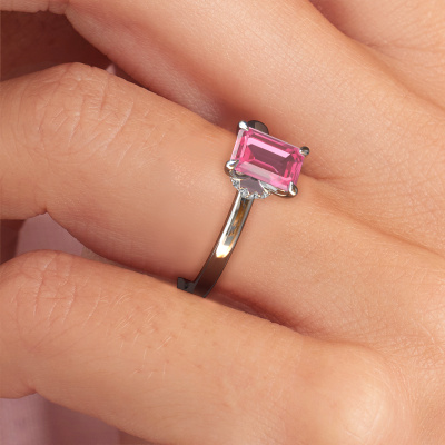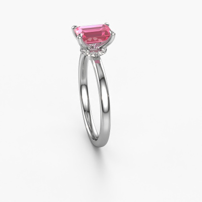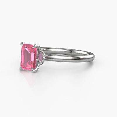 Bovenstaande verlovingsring heeft de naam Crystal EME 3, dit type verlovingsring noemen we een solitaire ring omdat hij een enkele edelsteen bevat. De verlovingsring is uitgevoerd in platina en heeft een smaragd geslepen roze saffier ter grootte van 7x5 mm. Deze klassieke platina solitaire ring met een schitterende smaragd geslepen roze saffier is een prachtige verlovingsring. Doordat de chatonzetting open is, is de lichtinval op de edelsteen optimaal. Ook plaatsen we de edelsteen hoog op de ring, waardoor deze extra opvalt. De diamant is bijvoorbeeld een prachtige edelsteen om aan de liefde van je leven te schenken, omdat deze symbool staat voor eeuwige liefde en zuiverheid. En dit symbool straalt midden op deze solitaire ring. Zo heeft iedere edelsteen een mooie symbolische betekenis. Deze solitaire verlovingsring kunt u zelf samenstellen in verschillende edelmetaal combinaties. Deze heeft de combinatie platina met platina. Ieder juweel is gemaakt door een team van gedreven goudsmeden en designers. Hierdoor zal dit unieke pronkstuk een echte eyecatcher zijn.Door onze modernste technieken kunnen wij met uiterste precisie prachtige sieraden te ontwerpen en voor jou personaliseren in de hoogste juwelierskwaliteit. Tegelijkertijd zijn onze verlovingsringen altijd 30% goedkoper dan bij een andere juwelier. Dit komt doordat alle verlovingsringen pas vervaardigd worden op het moment dat deze besteld wordt en we daardoor geen dure voorraden hoeven te hanteren. Mocht je aan een bepaald budget gebonden zijn, kunnen we je graag adviseren welke combinatie je het beste kunt kiezen.Heb je zelf een speciale ring in gedachten, die je wellicht ergens gezien hebt? Je kunt je ideeën altijd met ons bespreken, wij zetten graag jouw ontwerp om tot een unieke verlovingsring. Het ontwerp kun je volgen, omdat wij met 3D tekeningen werken. Hierdoor krijg je al een realistische indruk van hoe jouw ontwerp er in het echt uit komt te zien. Wij sturen je graag een vrijblijvende offerte, waarbij je ongetwijfeld verwonderd zult zijn over de prijs in combinatie met de uitstekende kwaliteit die we aanbieden.Om het voor jou makkelijker te maken kun je ieder besteld sieraad binnen 30 dagen na aflevering eenvoudig weer retour sturen.