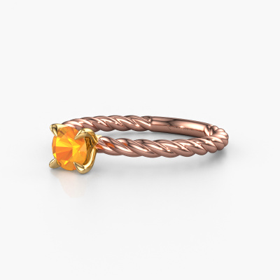 Bovenstaande verlovingsring heeft de naam Twanna, dit type verlovingsring noemen we een solitaire ring omdat hij een enkele edelsteen bevat. De verlovingsring is uitgevoerd in 14 Carat rosé goud en heeft een ronde citrien ter grootte van 5 mm. Deze fantasie rosé gouden solitaire ring met een schitterende ronde citrien is een prachtige verlovingsring. Doordat de chatonzetting open is, is de lichtinval op de edelsteen optimaal. Ook plaatsen we de edelsteen hoog op de ring, waardoor deze extra opvalt. De diamant is bijvoorbeeld een prachtige edelsteen om aan de liefde van je leven te schenken, omdat deze symbool staat voor eeuwige liefde en zuiverheid. En dit symbool straalt midden op deze solitaire ring. Zo heeft iedere edelsteen een mooie symbolische betekenis. Deze solitaire verlovingsring kunt u zelf samenstellen in verschillende edelmetaal combinaties. Deze heeft de combinatie 14 Carat rosé goud met goud. Ieder juweel is gemaakt door een team van gedreven goudsmeden en designers. Hierdoor zal dit unieke pronkstuk een echte eyecatcher zijn.Wist je dat we een beste prijs garantie geven voor jouw verlovingsring? Dit is mogelijk omdat al onze sieraden met de hand gemaakt worden in ons eigen atelier. We hebben geen dure voorraden, en we maken pas je verlovingsring op het moment dat je besteld hebt. Doordat we de hele productie zelf in de hand hebben, kunnen wij je goed informeren over alle eigenschappen van deze ring. Juist omdat het kopen van een verlovingsring online spannend is, begrijpen wij dat het fijn is om alle kenmerken te weten van jouw ring.Heb je zelf een speciale ring in gedachten, die je wellicht ergens gezien hebt? Je kunt je ideeën altijd met ons bespreken, wij zetten graag jouw ontwerp om tot een unieke verlovingsring. Het ontwerp kun je volgen, omdat wij met 3D tekeningen werken. Hierdoor krijg je al een realistische indruk van hoe jouw ontwerp er in het echt uit komt te zien. Wij sturen je graag een vrijblijvende offerte, waarbij je ongetwijfeld verwonderd zult zijn over de prijs in combinatie met de uitstekende kwaliteit die we aanbieden.Om het voor jou makkelijker te maken kun je ieder besteld sieraad binnen 30 dagen na aflevering eenvoudig weer retour sturen.